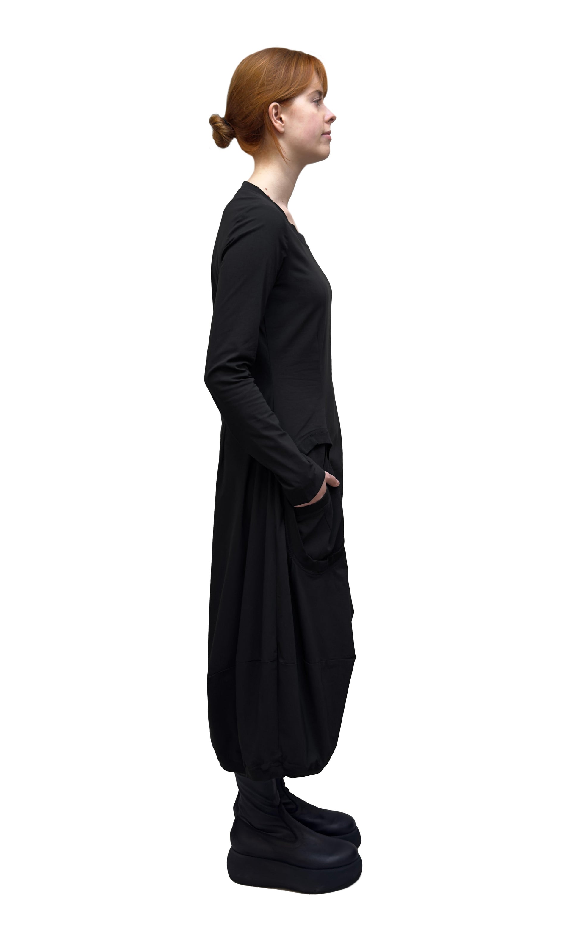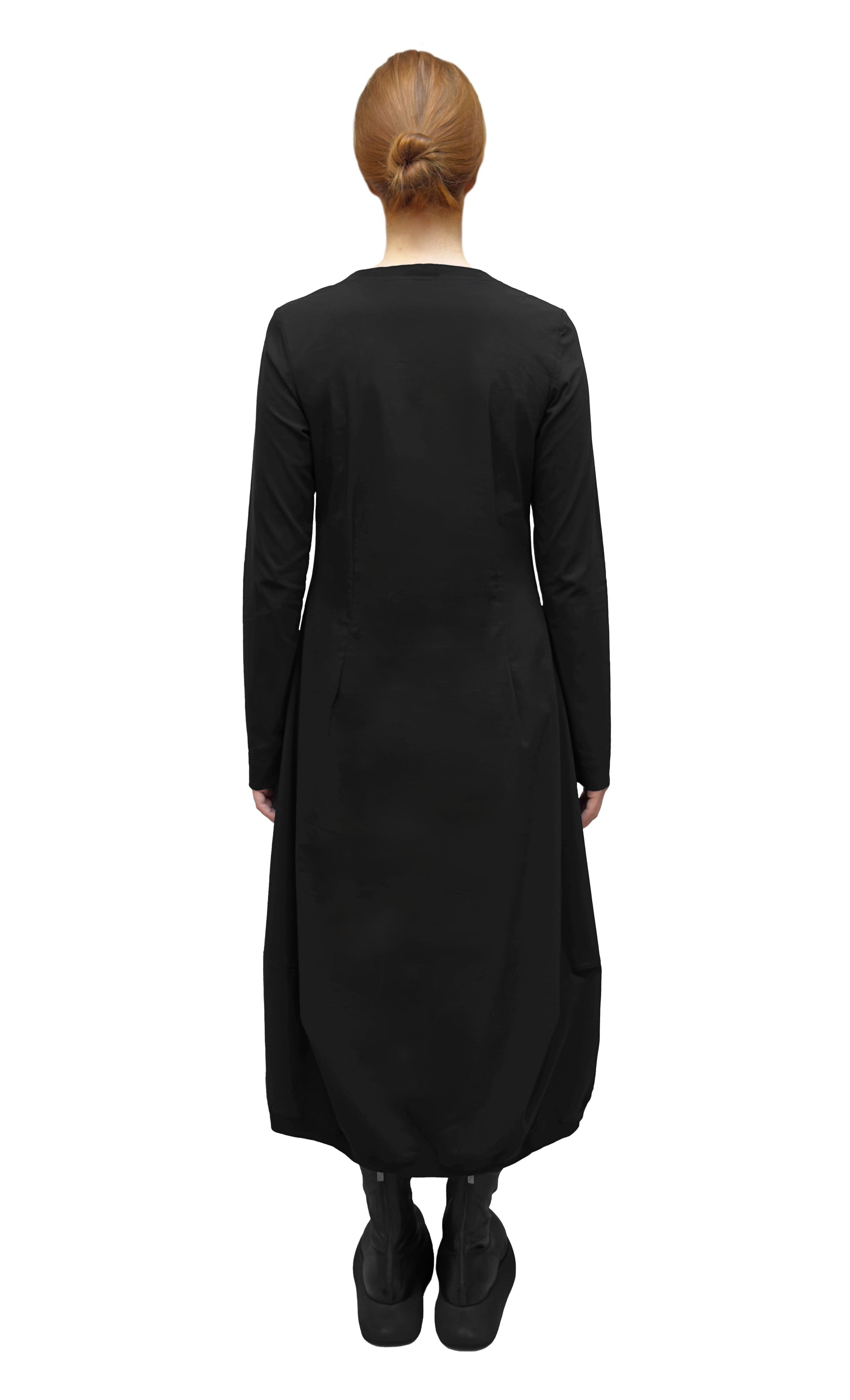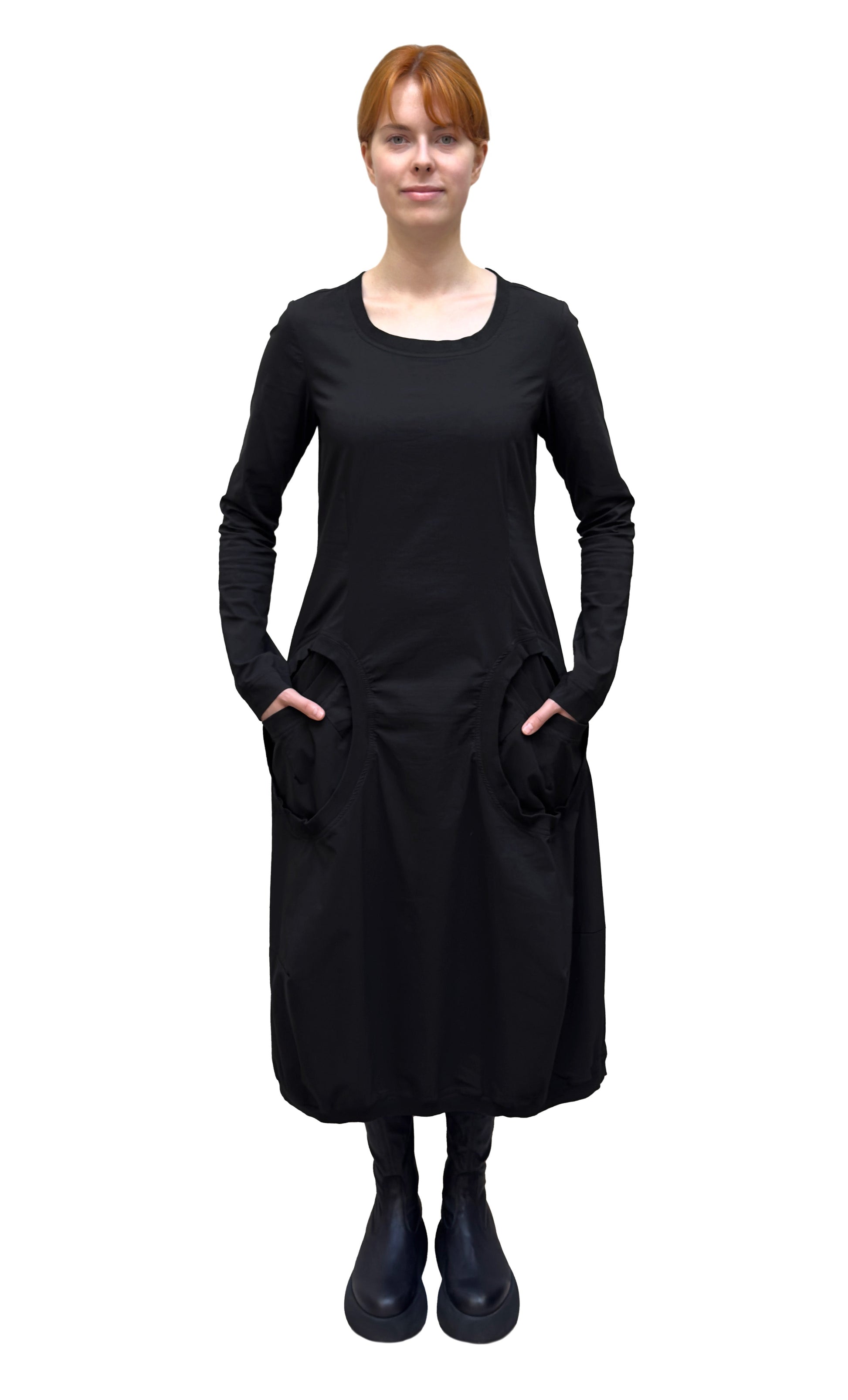 A classic Black Label dress with a sculpted bubble skirt in a comfortable cotton blend fabric with stretch. This silhouette features a round neck, long slim sleeves and front rounded pockets with an elastic rib trim.