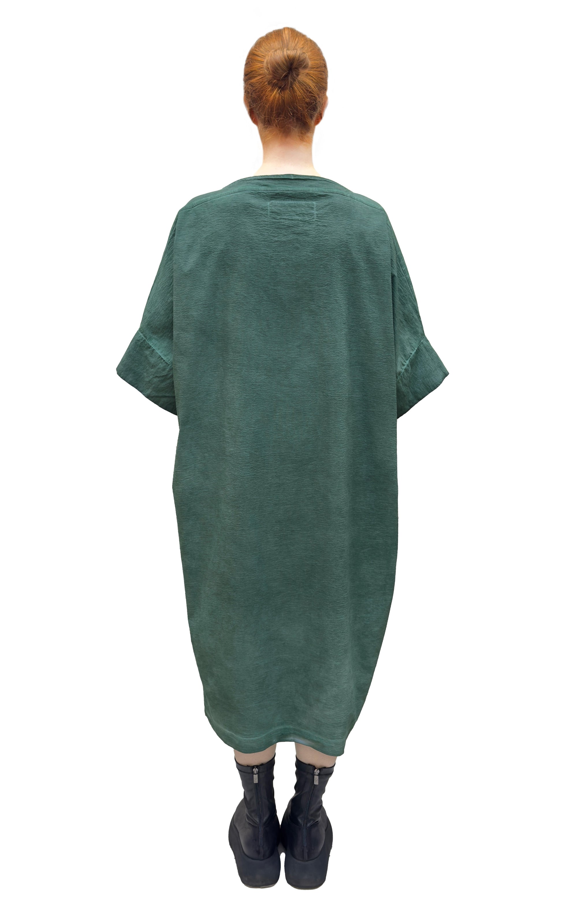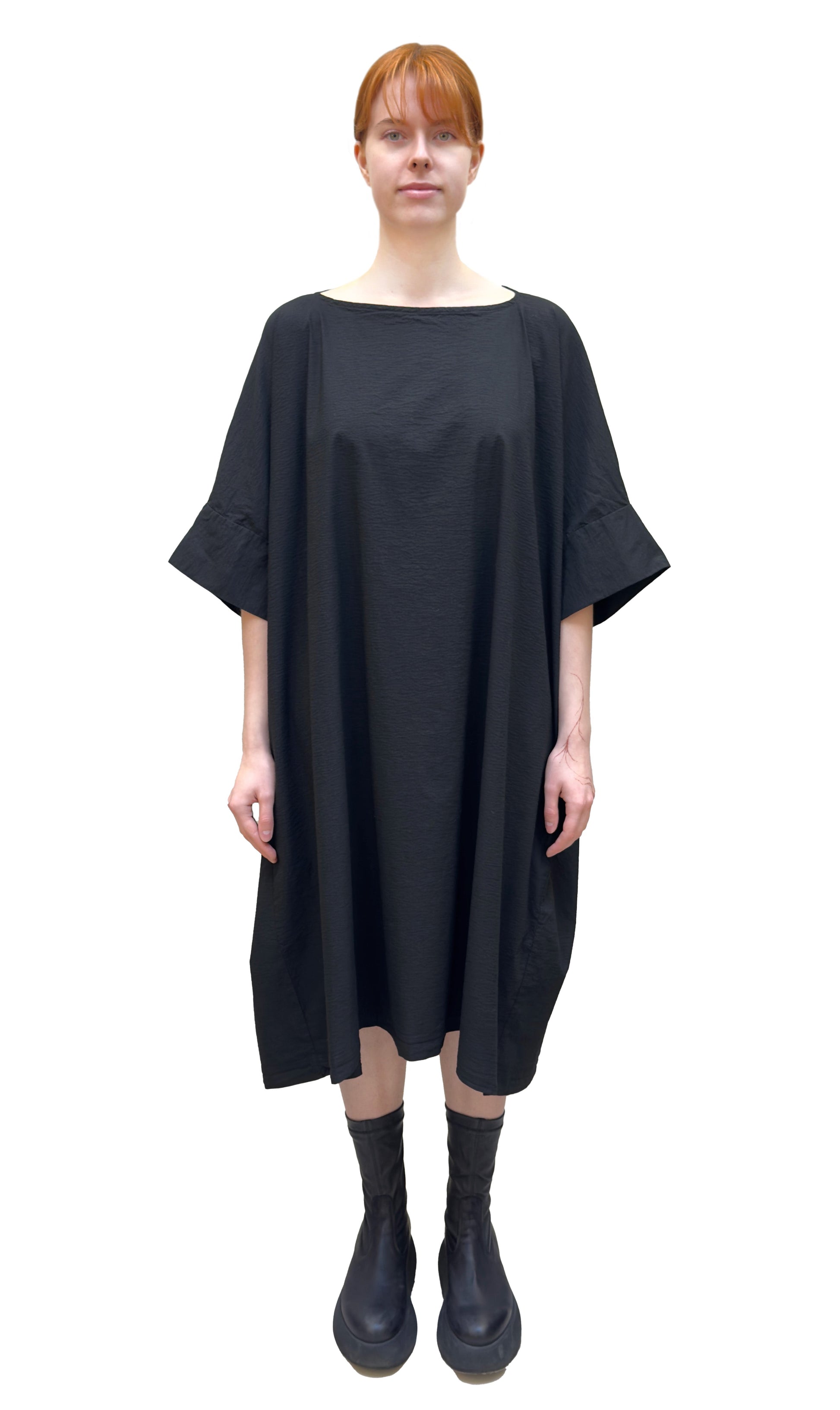 An amazing dress by Rundholz DIP using their signature dyeing process to create a beautiful mottled black tone. Crafted from a light, stretchy, woven viscose blend fabric with a fine vertical rib. The dress has an oversized, boxy cut with dropped shoulders and wide short sleeves, an a wide boatneck and side seam pockets. A versatile piece to layer with t-shirts underneath and sweaters and jackets overtop.
