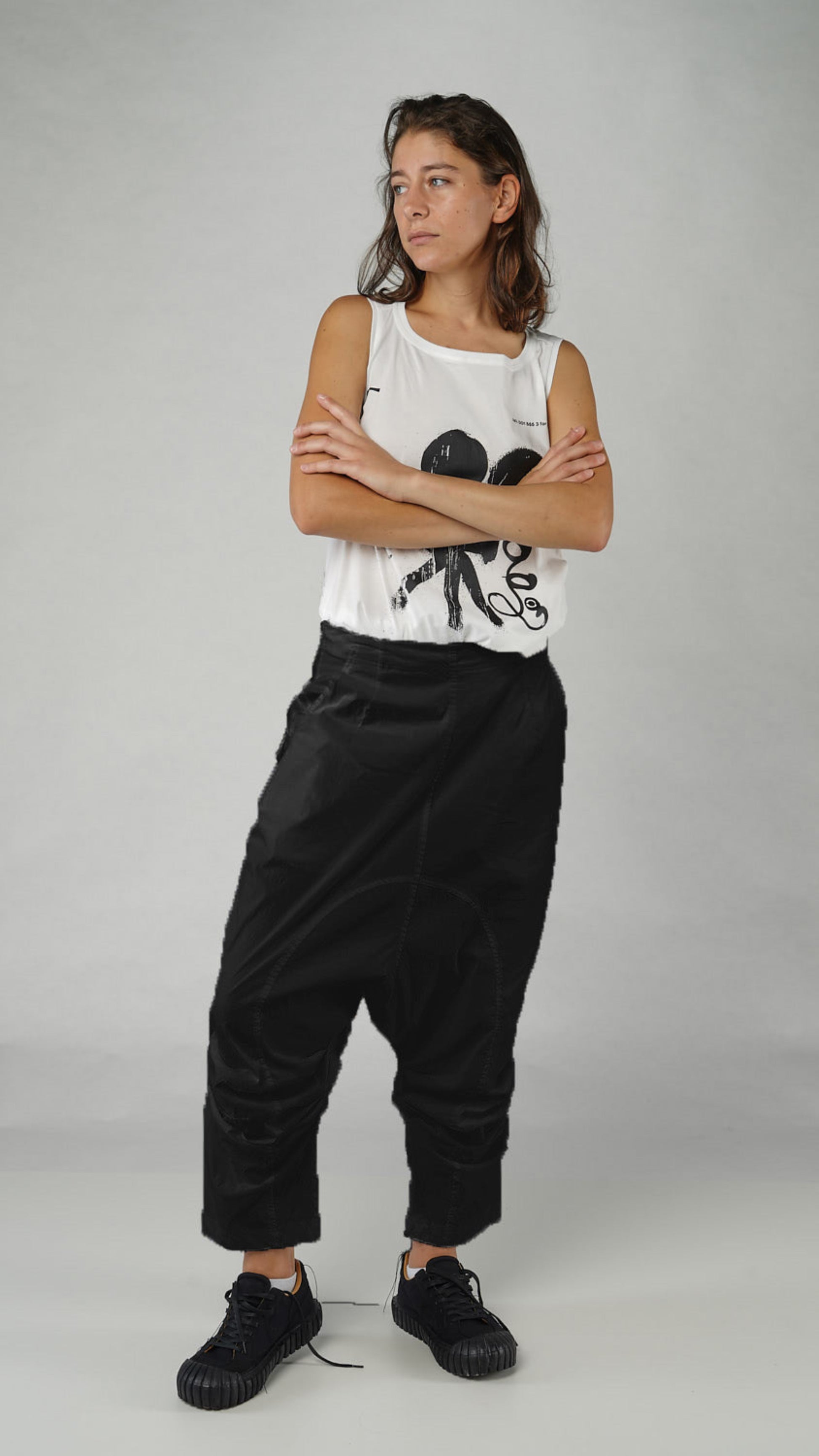 A pull-on pair of pants by Rundholz Dip crafted from a light, stretchy cotton blend fabric. They feature a drop rise cut with ruching and darts at the knees for a funky look. There are slash pockets at the front and flap pockets at the back. An easy and funky pant!