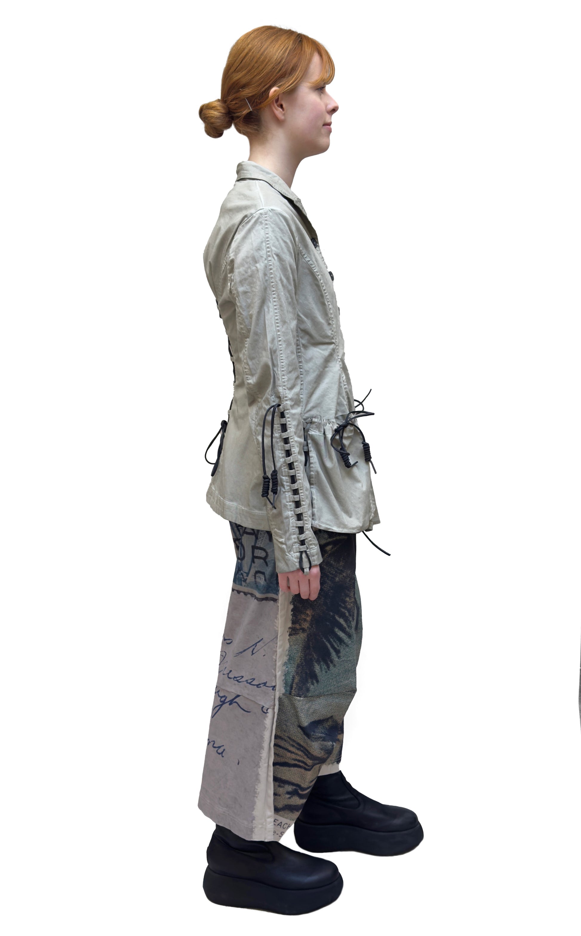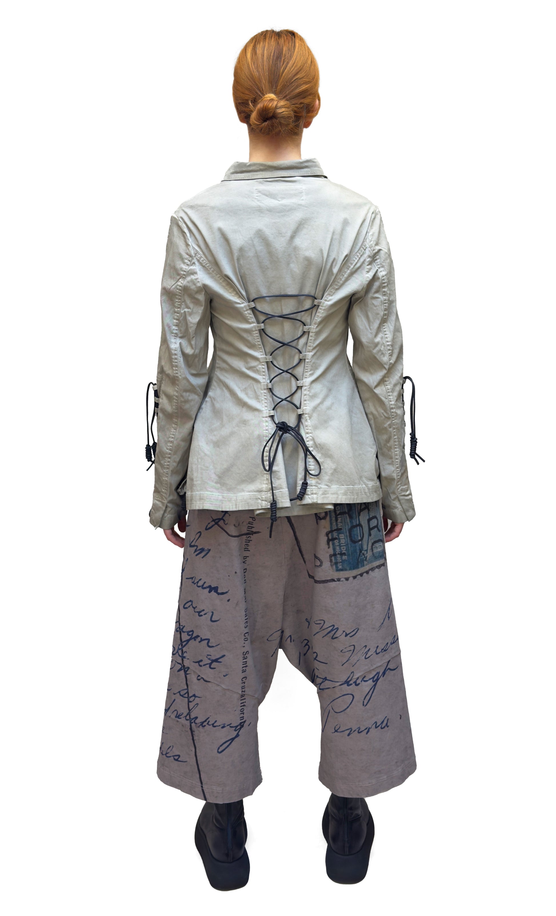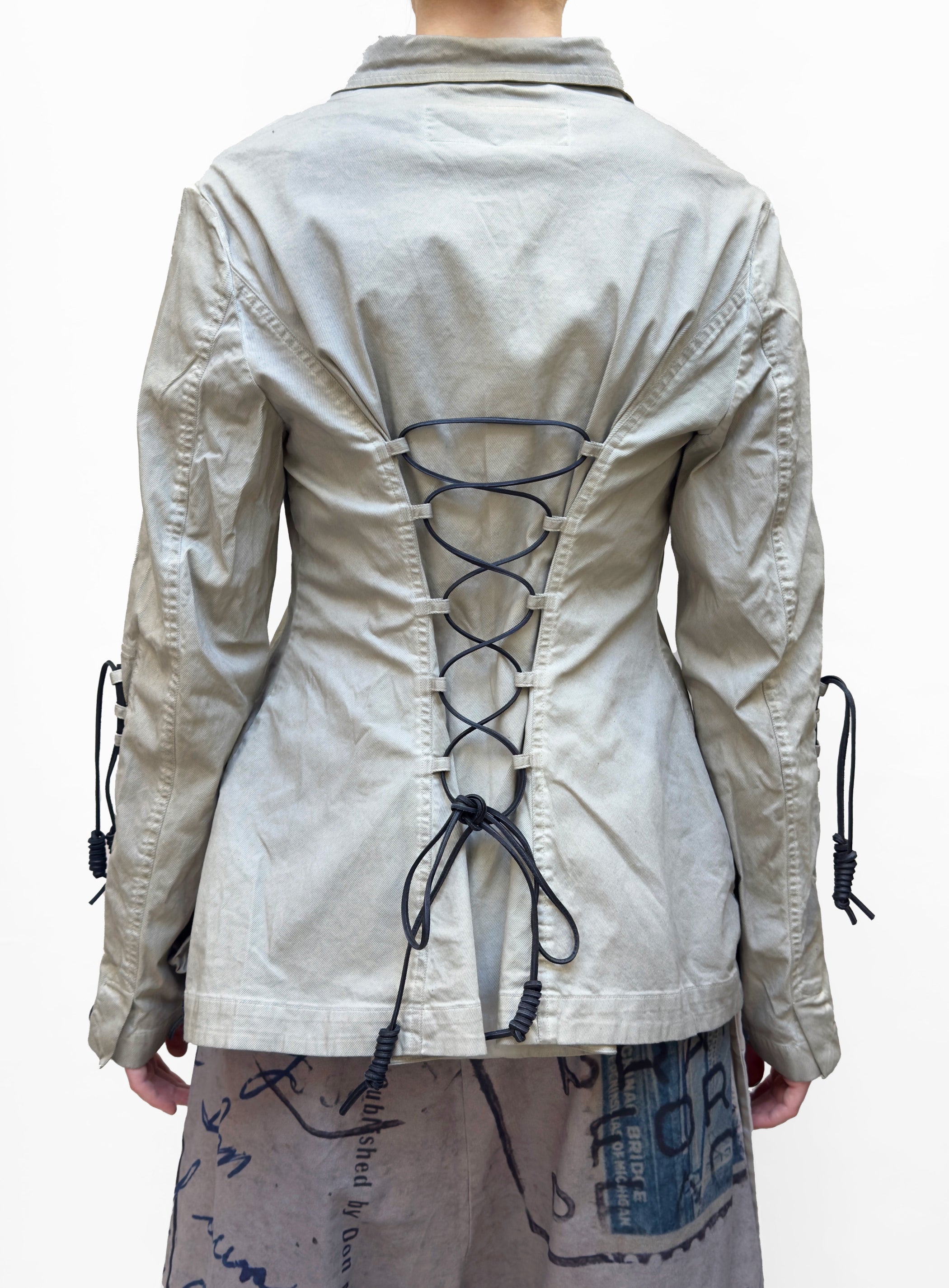 Statement jacket from Rundholz Dip in a cotton twill with a slight stretch, featuring a button closure at the front, leather lacing at the centre back, sides of the sleeves and framing the 2 front patch pockets. The silhouette can be altered with the laces to your desired fit.