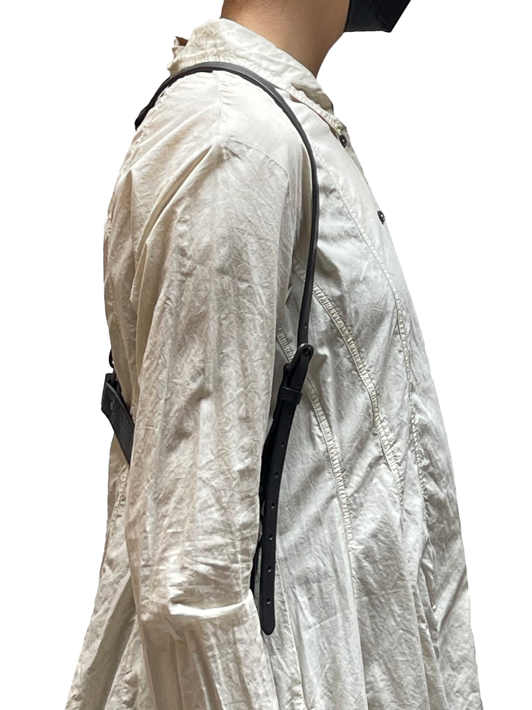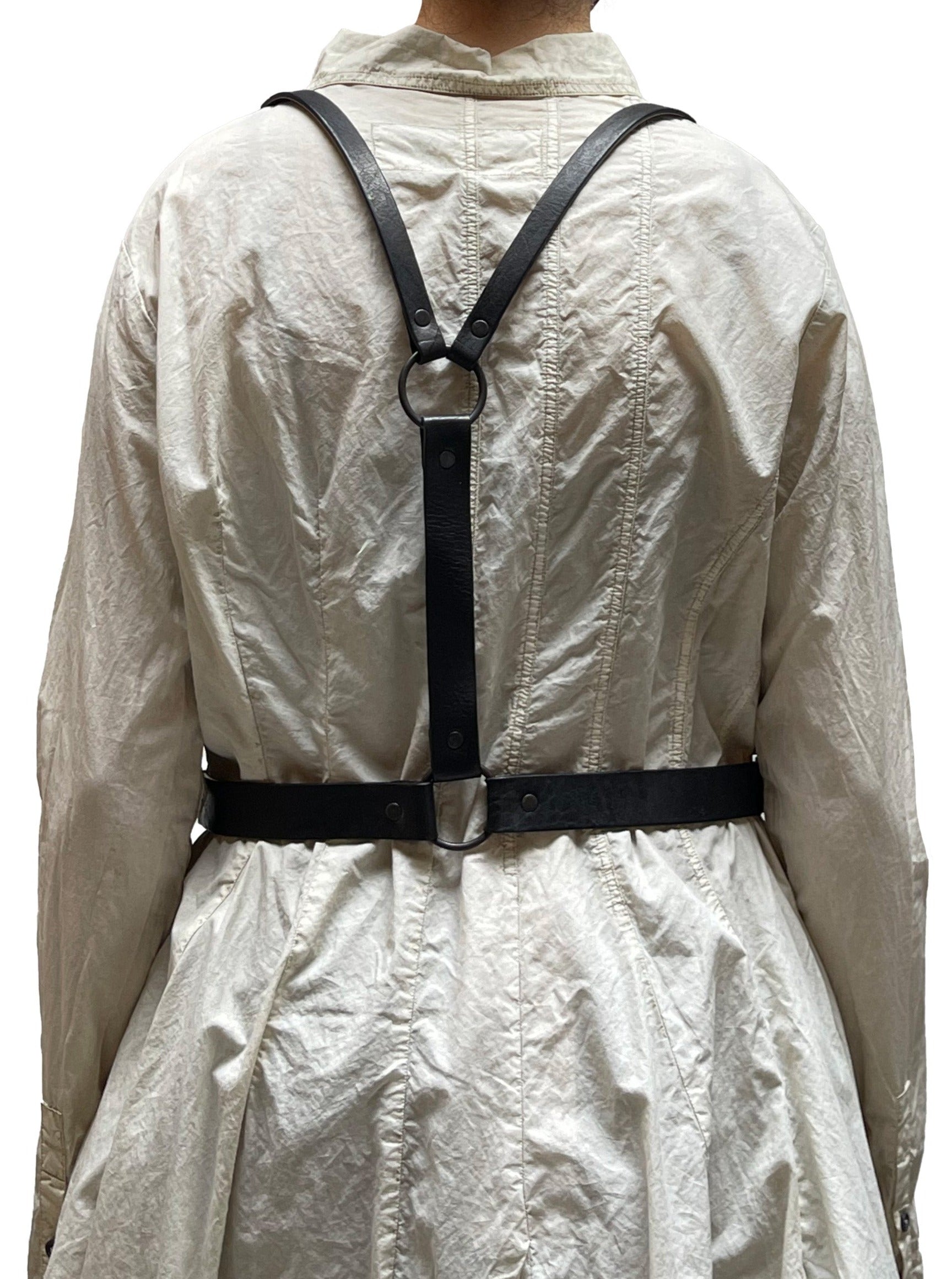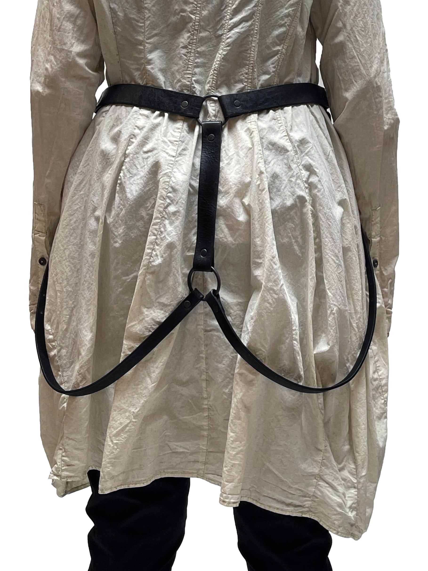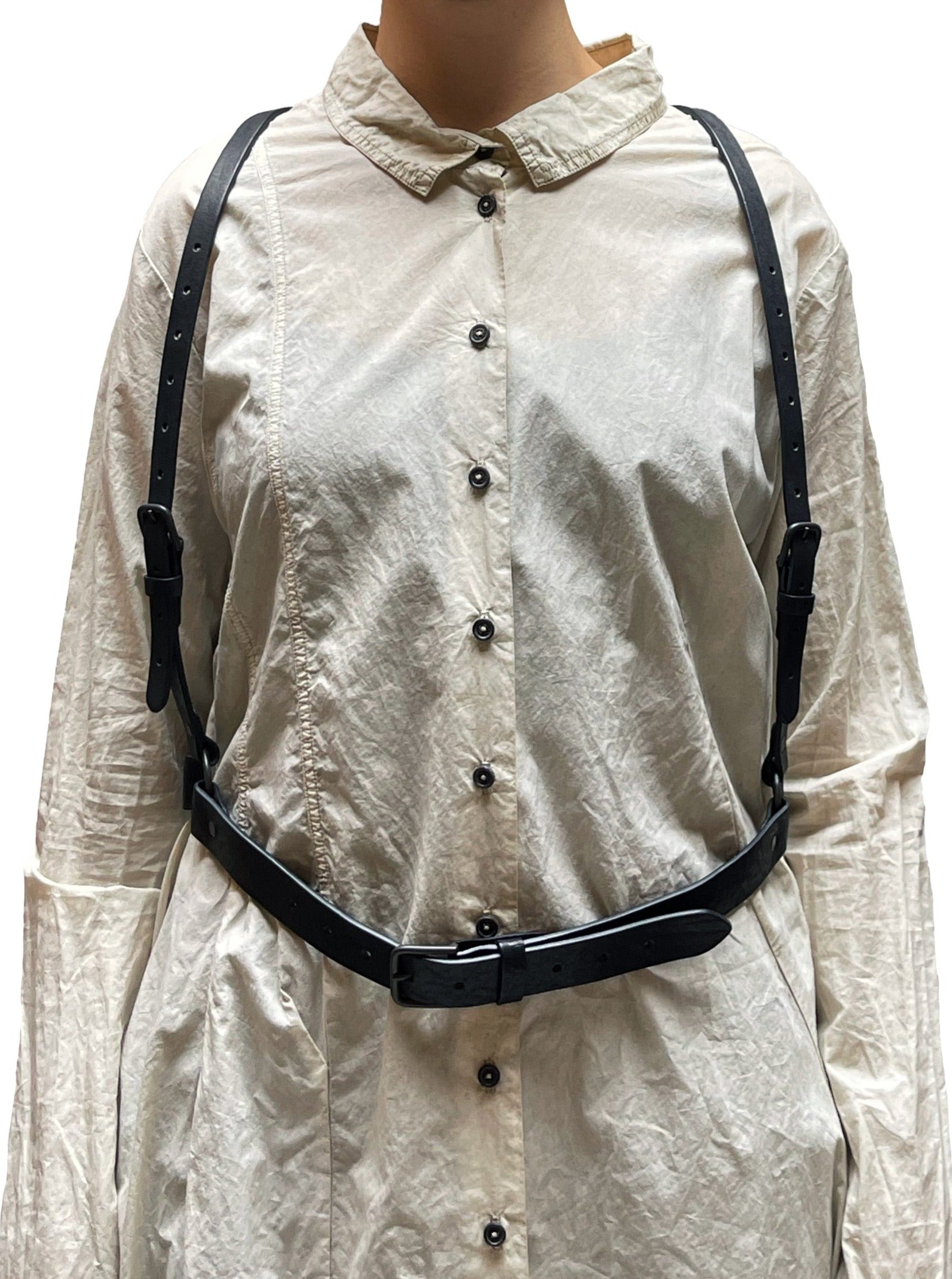 Leather harness belt. Adjustable in all directions. Waist belt adjusts from 32" to 42". Can be worn in multiple ways as shown in the photos.
