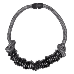 An elegant necklace made of thick grey cord and black murano glass rings. There is a magnetic closure at the back. This necklace sits short in length at just below the collarbone.