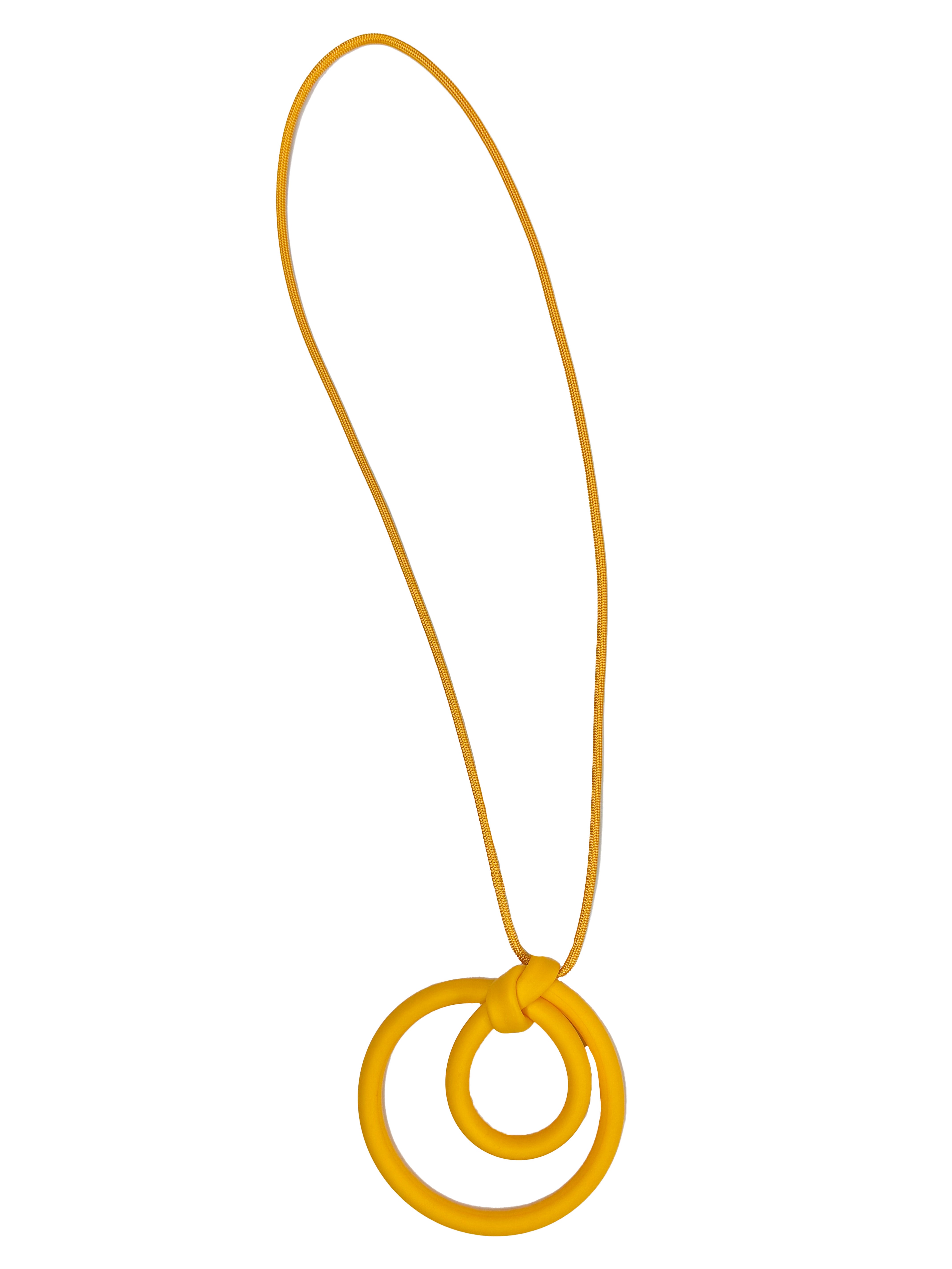 A colourful and uplifting necklace made of cord with a yellow rubber loop pendant. Lightweight and bright.