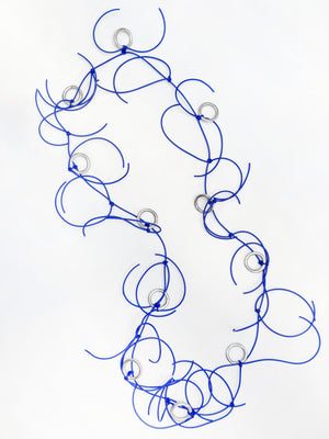 Whimsical necklace, made with blue plastic cord and aluminum rings.