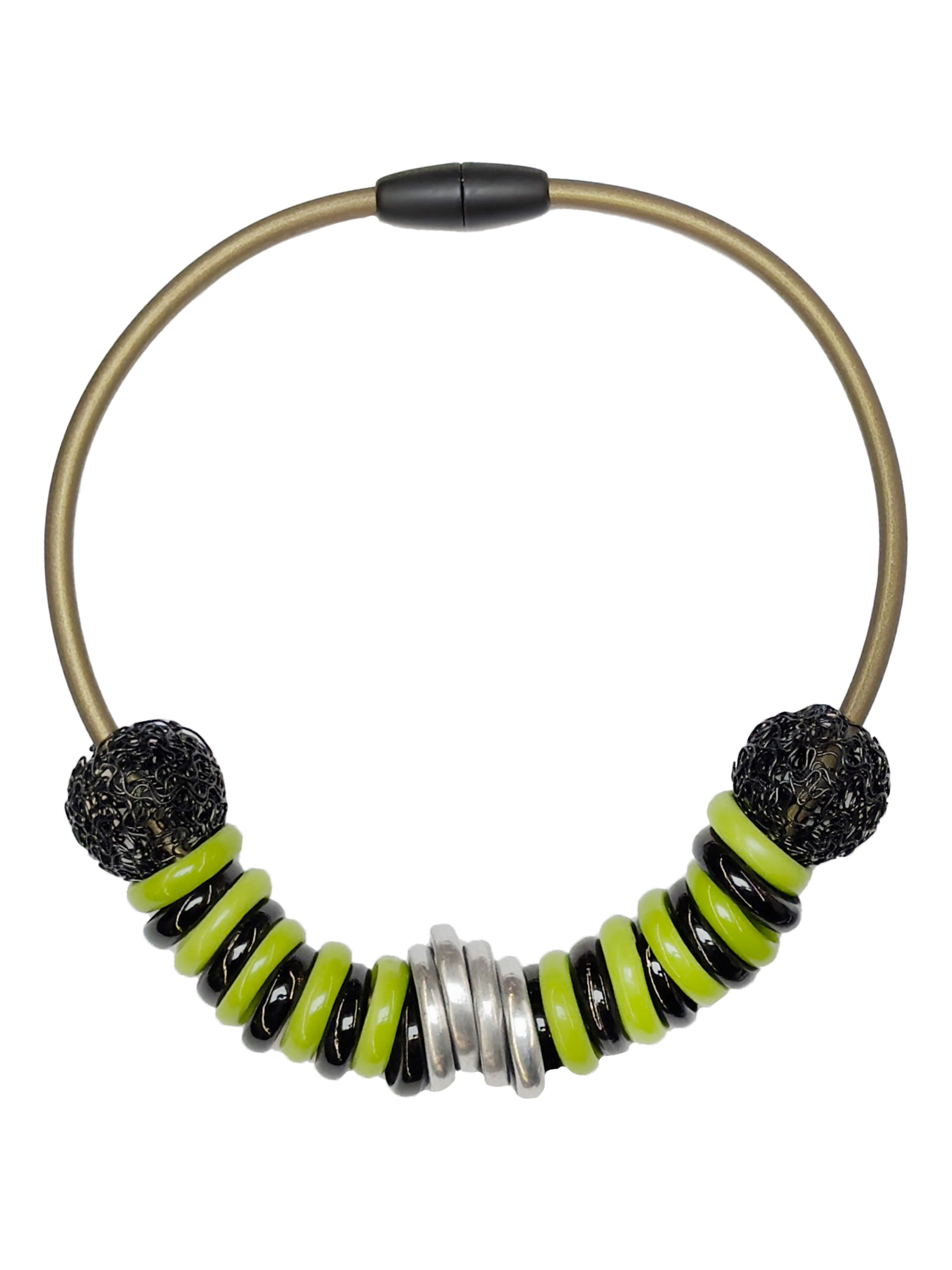 A wonderful necklace made of khaki green rubber with a magnetic closure at the back. It features metallic rings and glass rings in green and black, the wired beads add a funky touch. This necklace sits short in length at just below the collarbone.