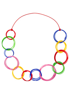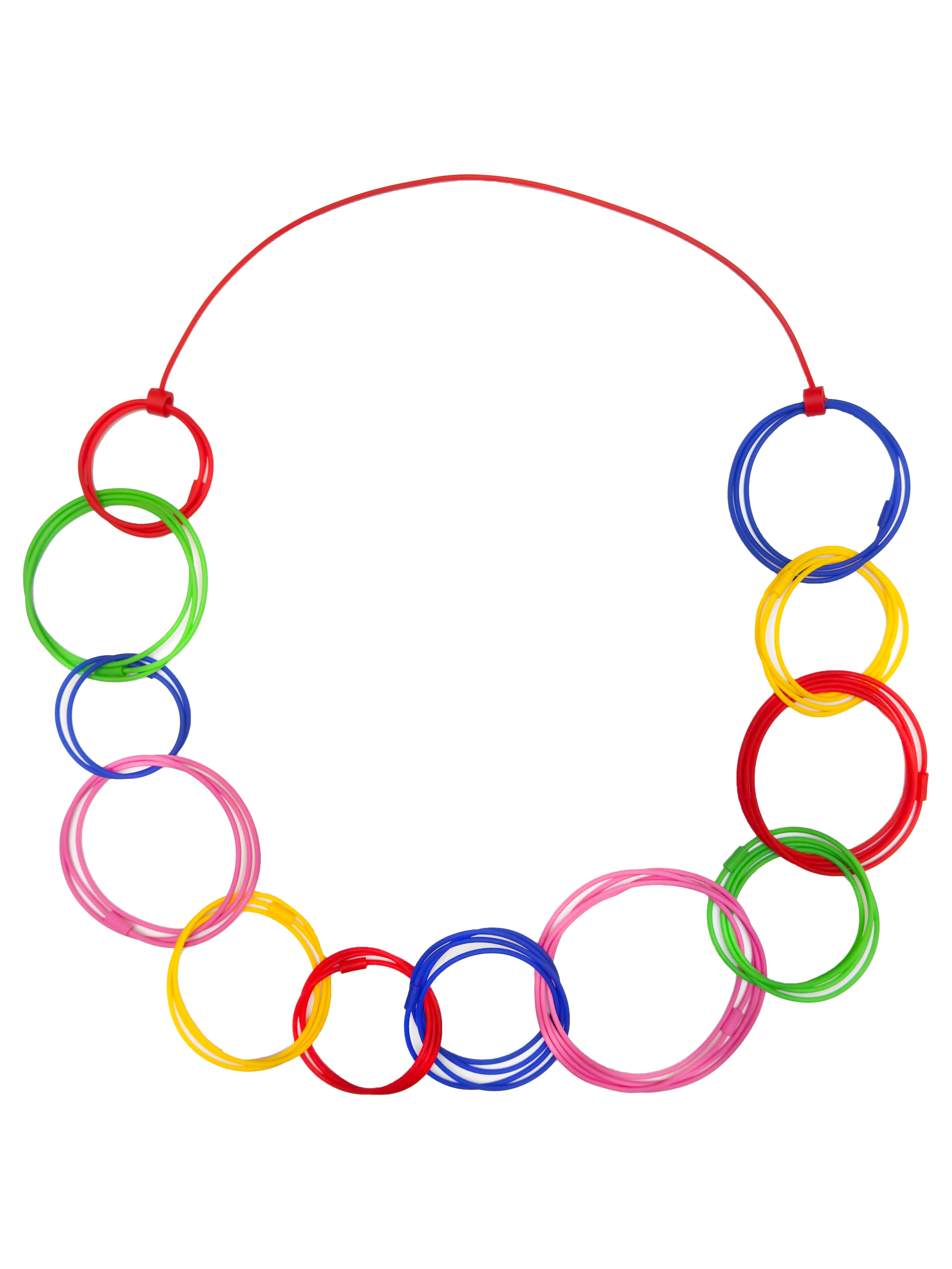 A colourful and uplifting necklace made of rubber circle links in red, yellow, green, pink and blue. Lightweight and medium length. A playful piece.