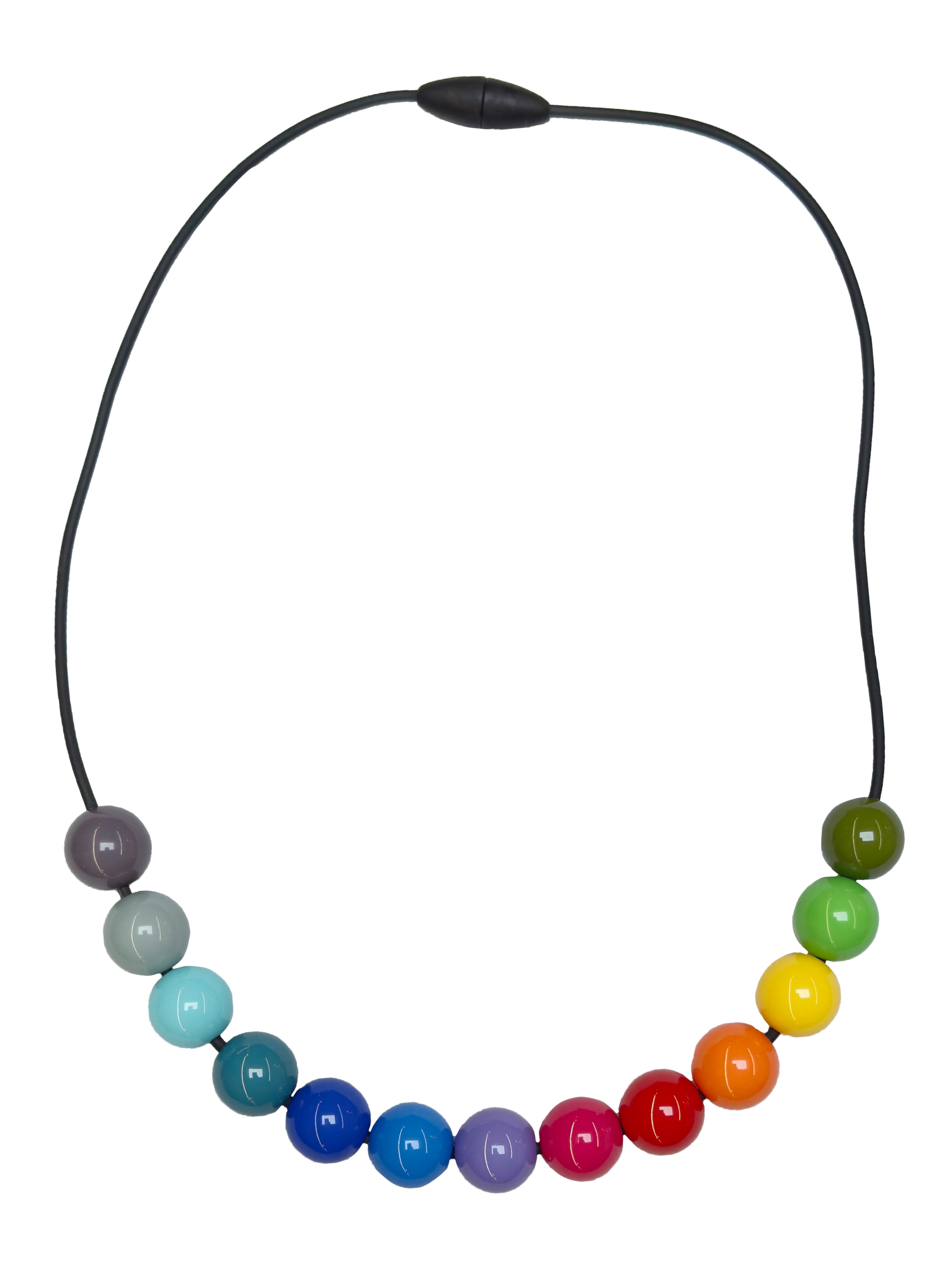 A fun and short necklace made of lightweight rubber and small plastic beads. Featuring a magnetic closure at the back this makes for an effortless piece. Add a pop of colour to any outfit!
