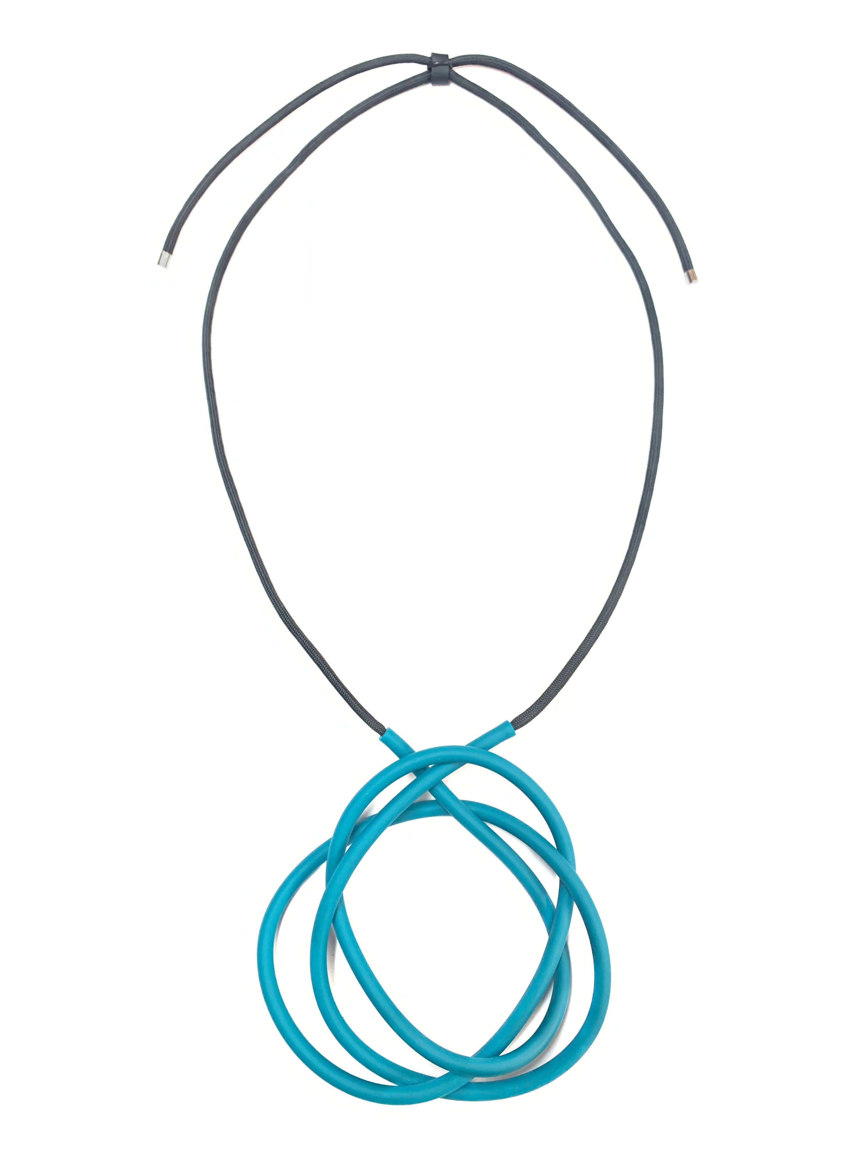 A colourful and uplifting necklace made of black cord with a teal rubber covered wire. pendent. Lightweight and bright with an adjustable closure.
