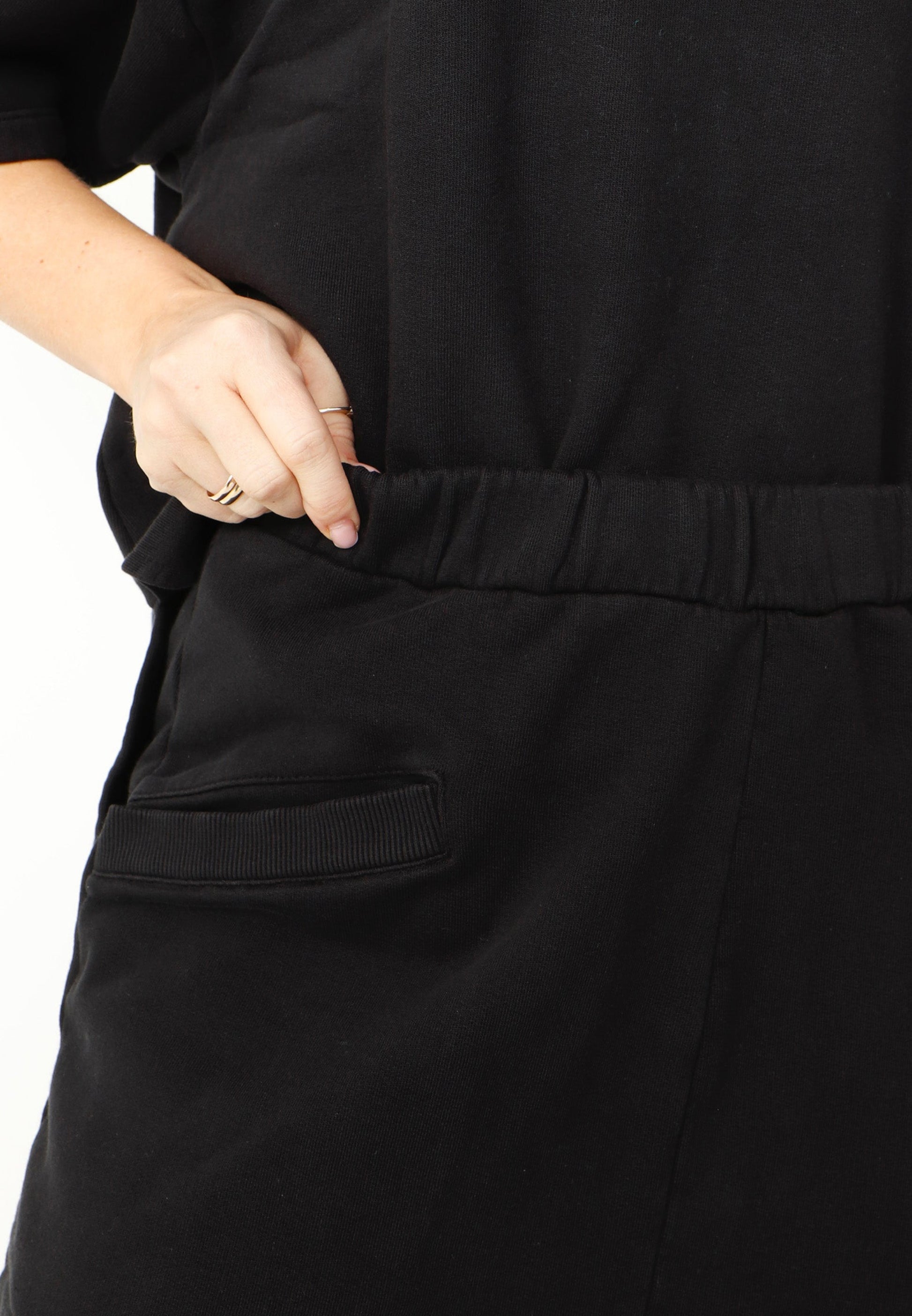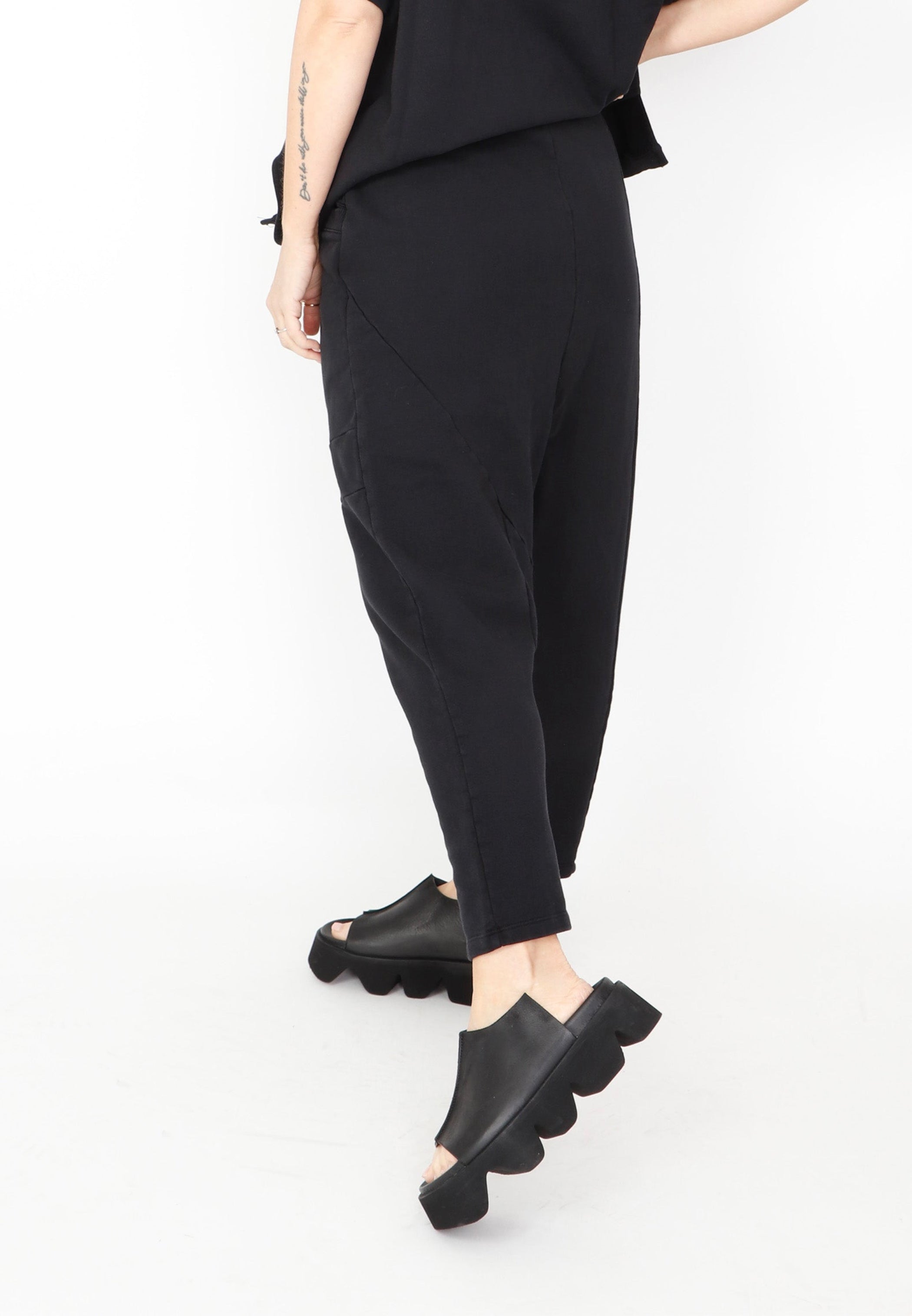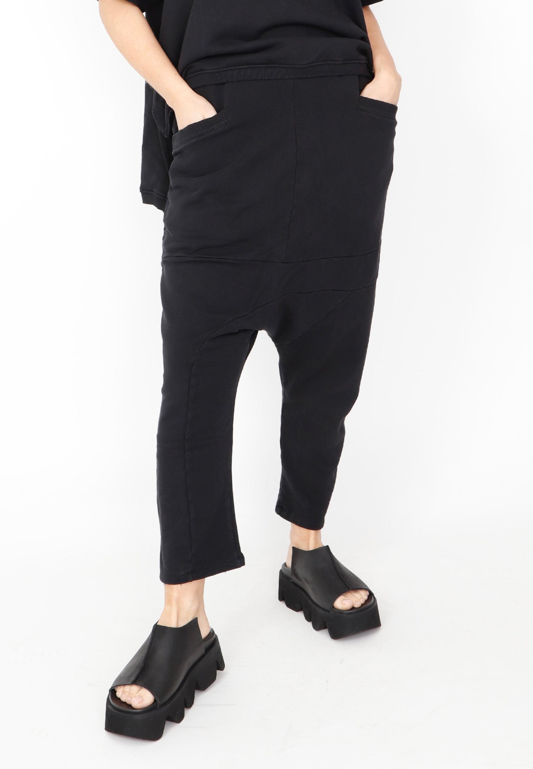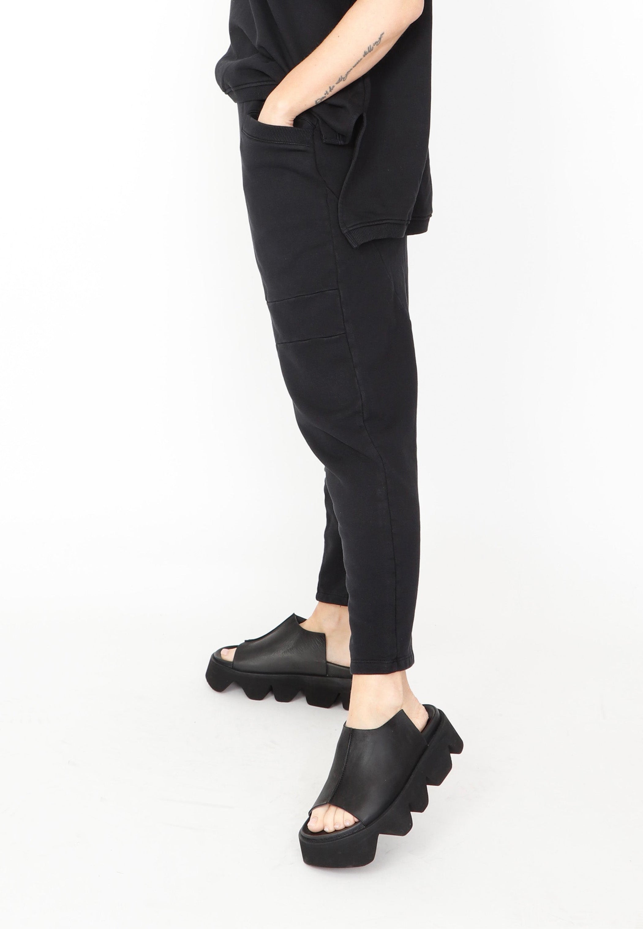 A drop rise pant by Sort Aarhus crafted from an organic cotton French Terry. It tapers down and features seamed detailing along the front and back. There are two large pockets at the front for practicality and the elasticized waist offers ease and comfort. It falls above the ankle for a flattering look.
