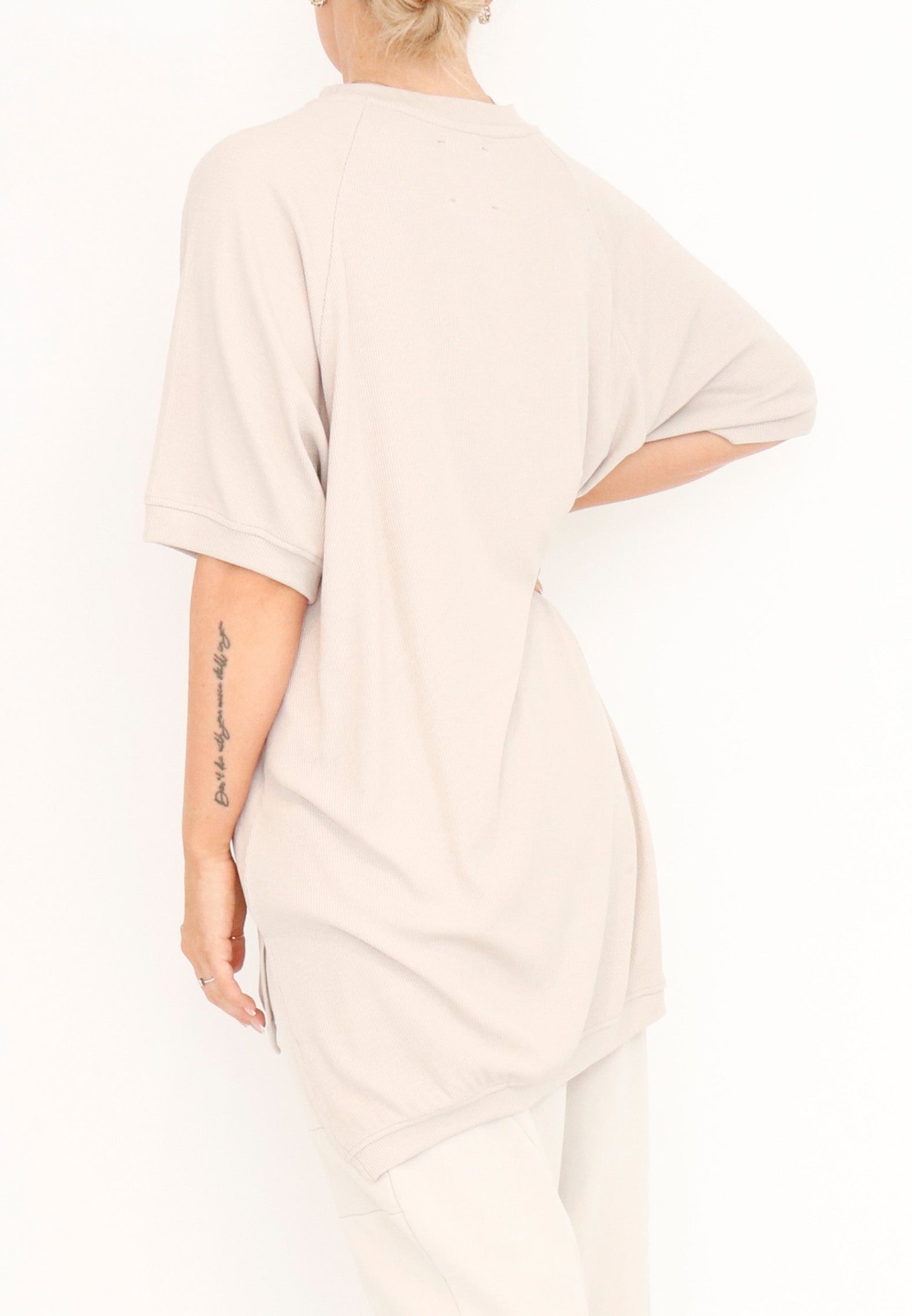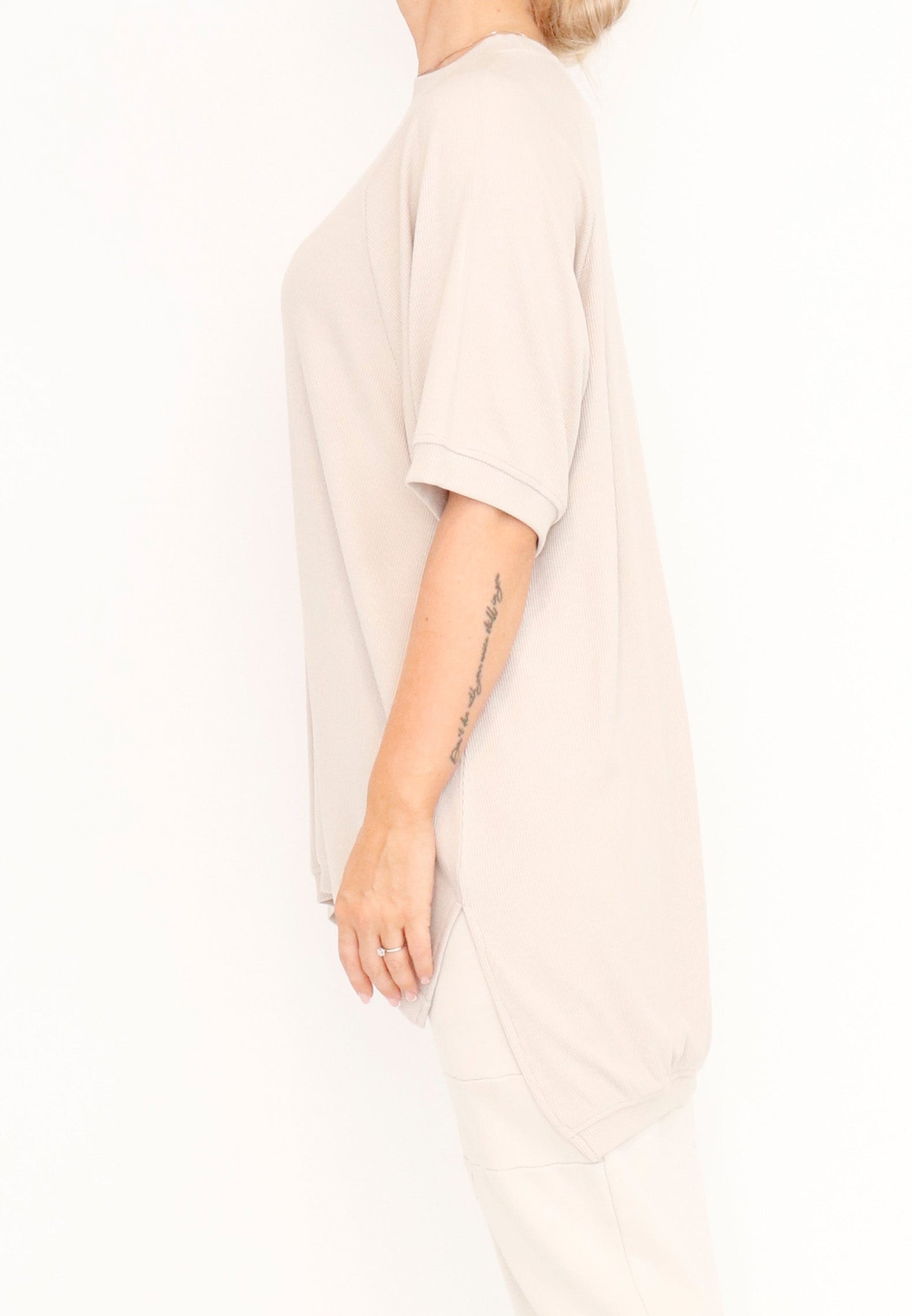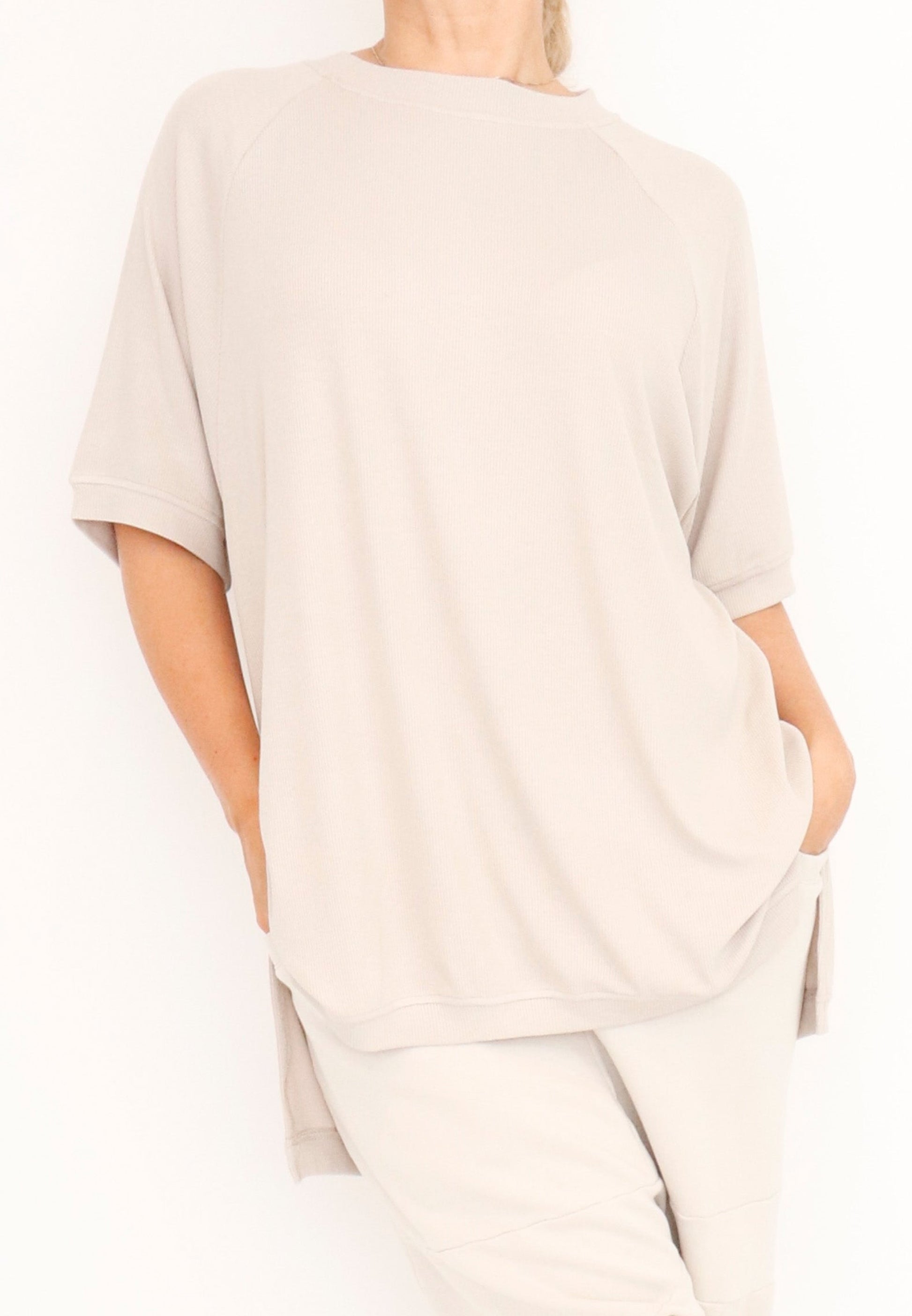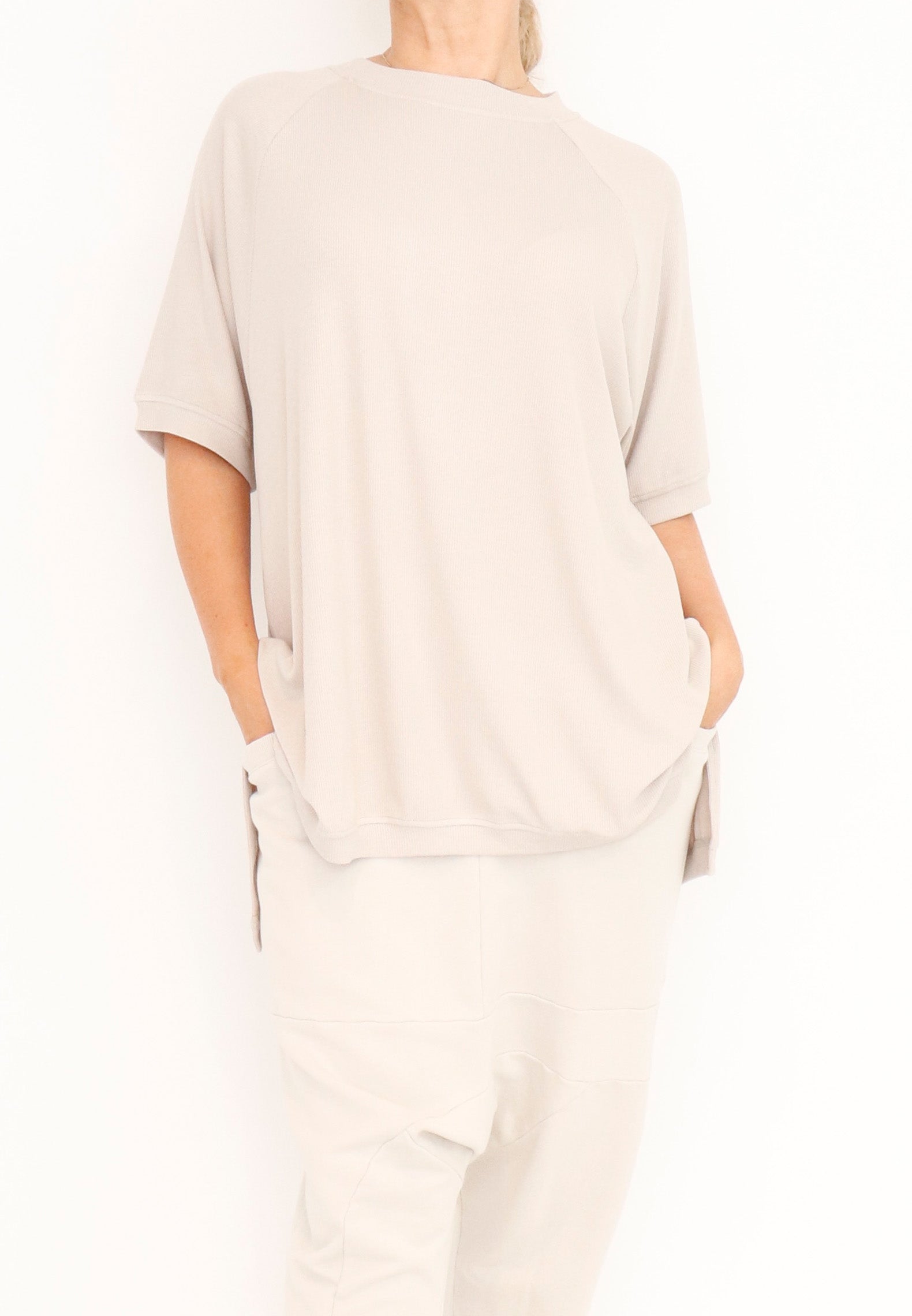 A relaxed top by Sort Aarhus crafted from a soft and light ribbed knit in a viscose blend. It boasts a flattering high round neck and short raglan sleeves. Featuring a hi low cut with 7" slits at the sides it makes for an essential piece.