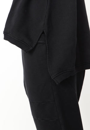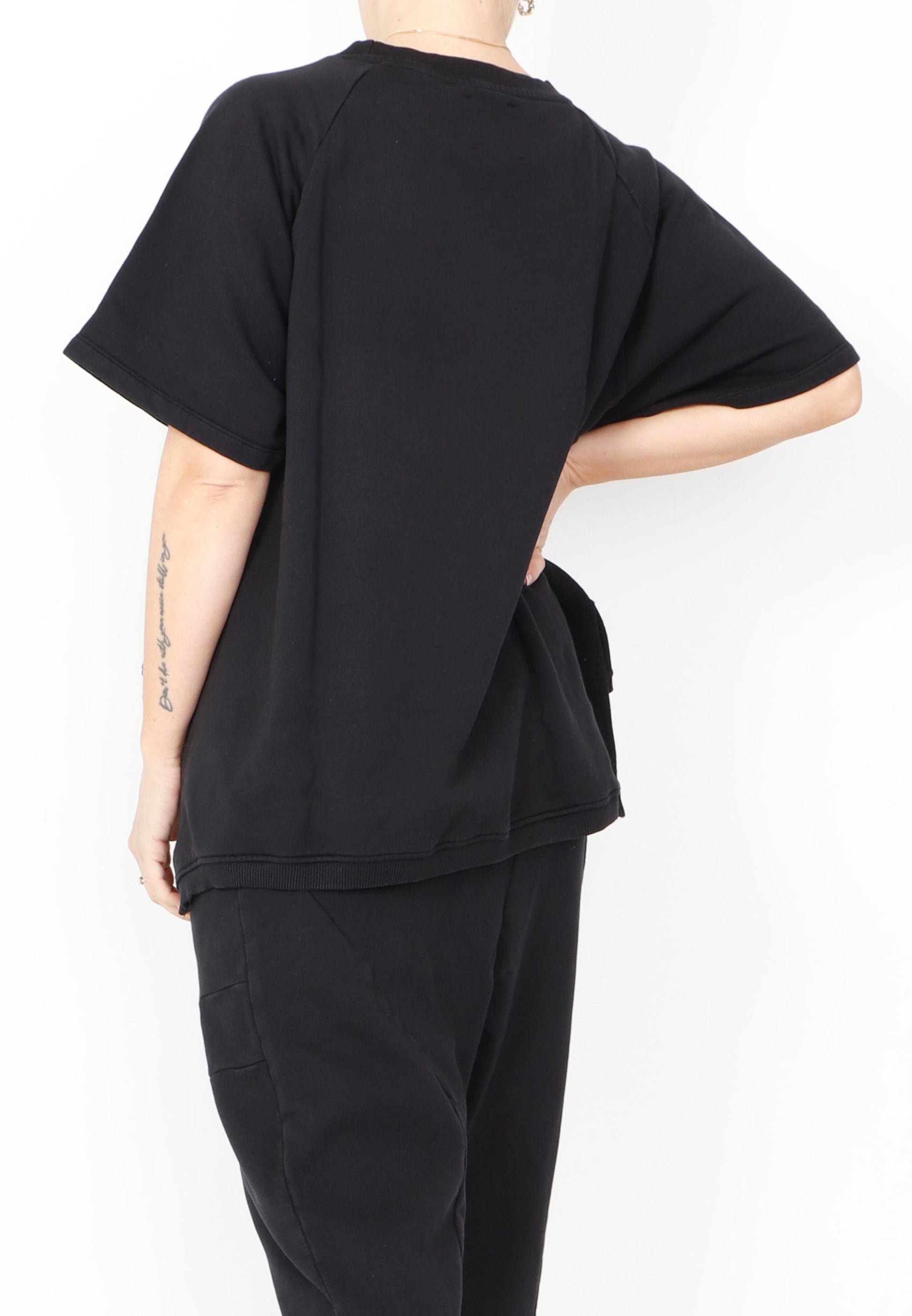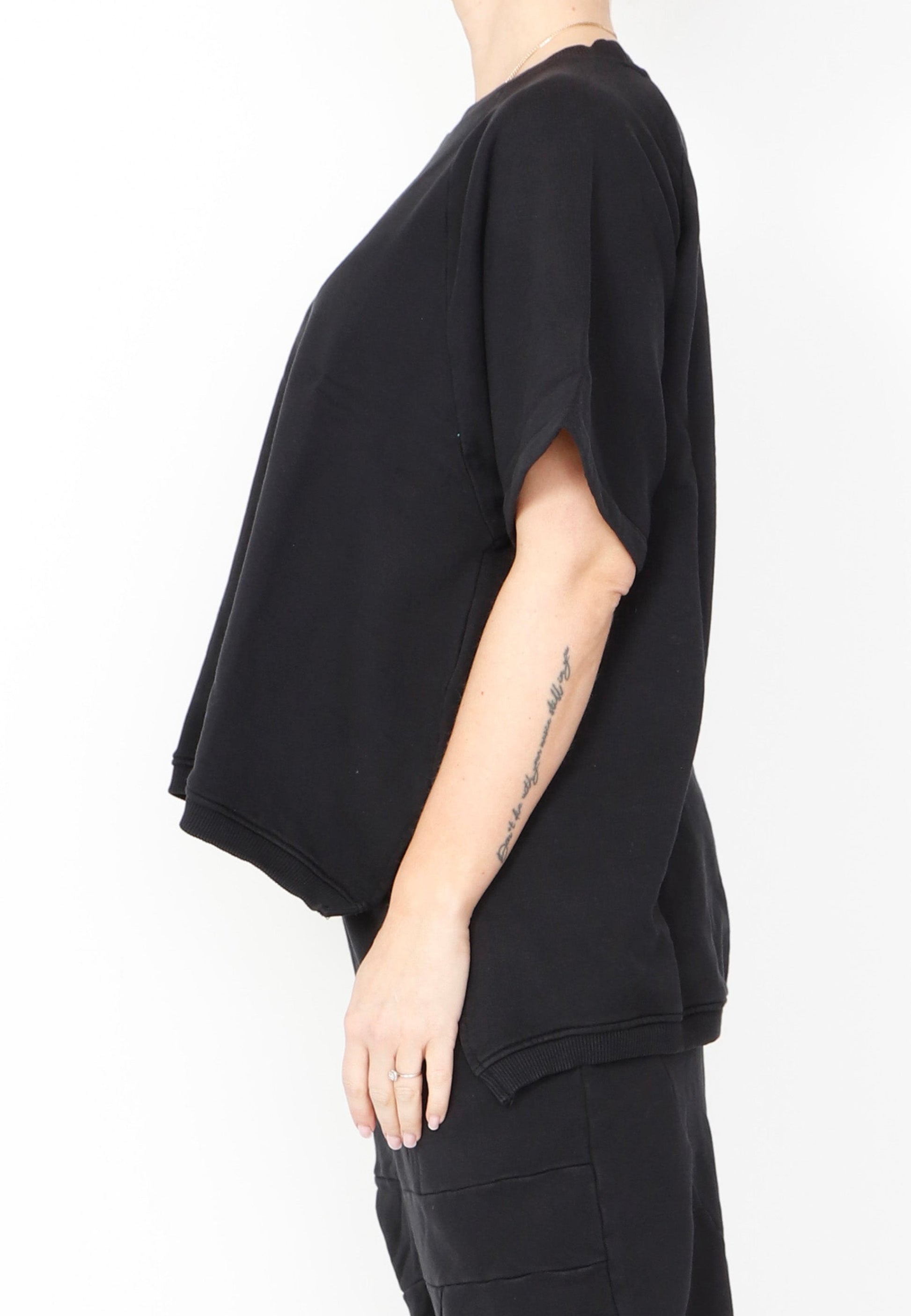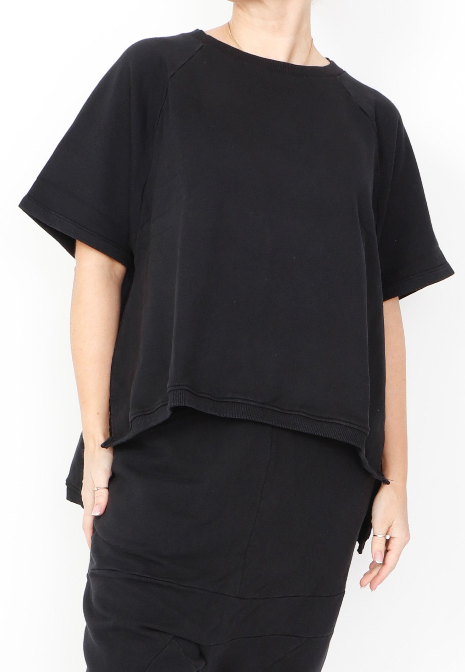 A relaxed top by Sort Aarhus crafted from an organic cotton French Terry. It boasts a flattering high round neck and short raglan sleeves. Featuring a hi low cut with 7" slits at the sides it makes for an essential piece.