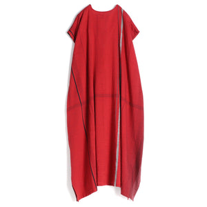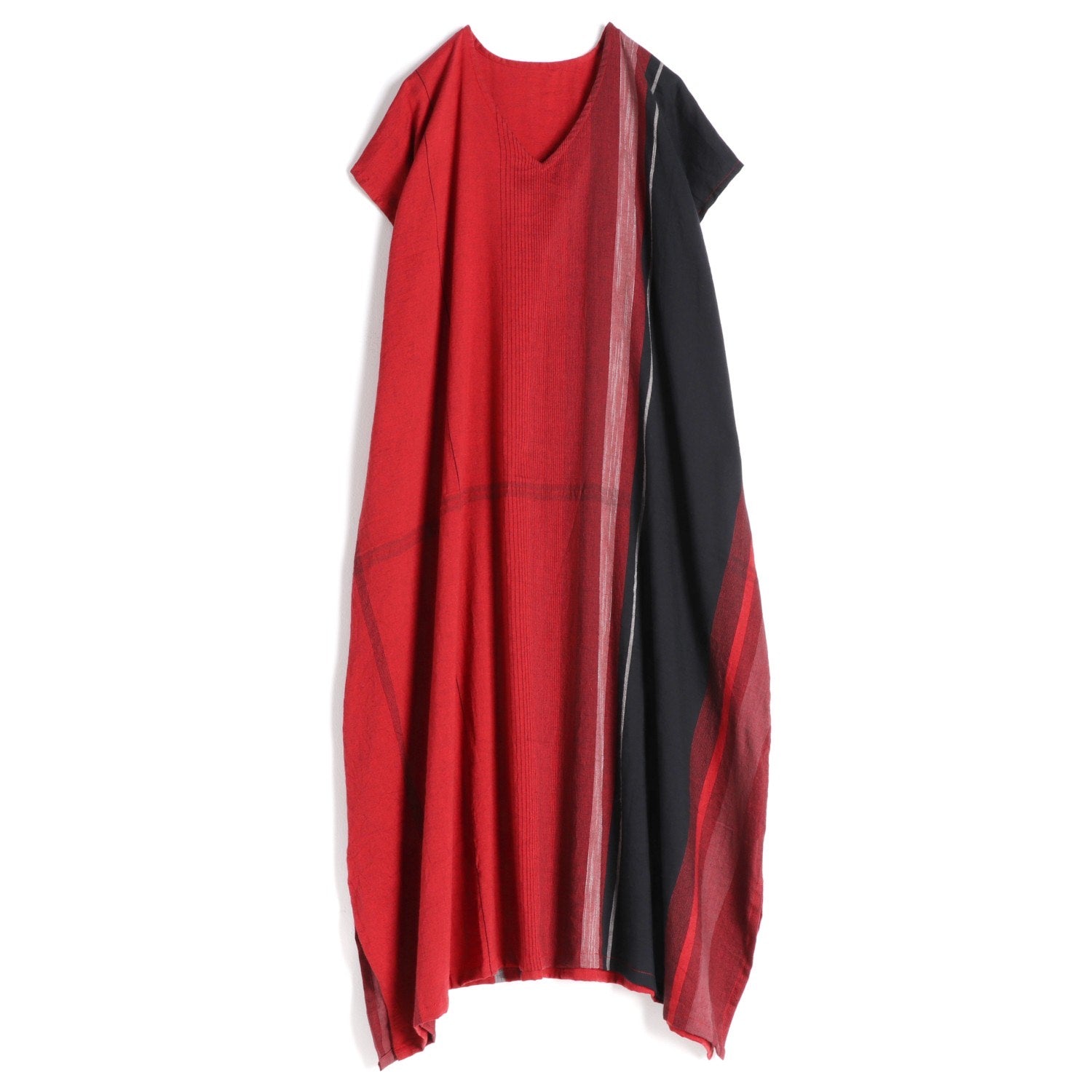 A relaxed V-neck, cap sleeved dress that you can wear front-to-back. Made of 100% cotton woven in varying sized stripes. It has a beautiful drape and falls to mid calf. There are 9” slits at the hem of the side seams.
