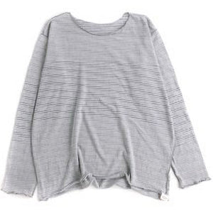 A relaxed tee with long sleeves, a round neck and serged seams. This tee is one-of-a-kind and can be worn inside out.