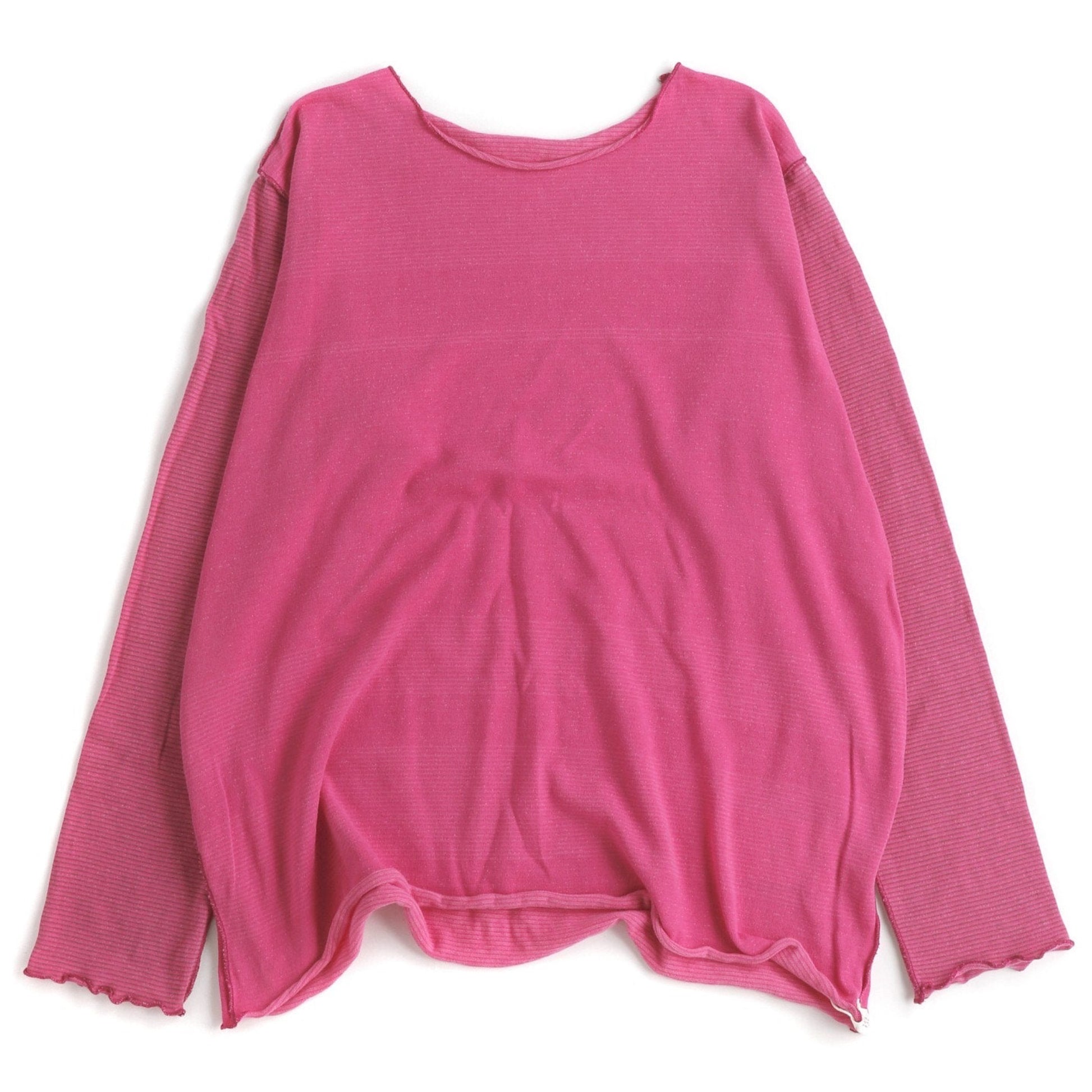 A relaxed tee with long sleeves, a round neck and serged seams. This tee is one-of-a-kind and can be worn inside out.
