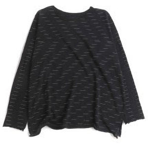 A relaxed tee with long sleeves, a round neck and serged seams. This tee is one-of-a-kind and can be worn inside out.