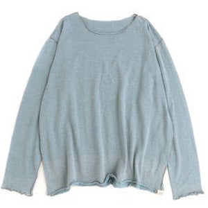 A relaxed tee with long sleeves, a round neck and serged seams. This tee is one-of-a-kind and can be worn inside out.