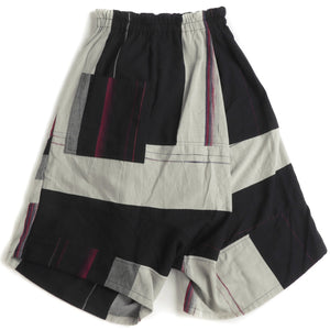 The pant is woven in a winter weight cotton. Each pant is unique and has an elastic waistband and falls to mid calf. There are deep bag pockets, one on the front and back. Can be worn with either side to the front.