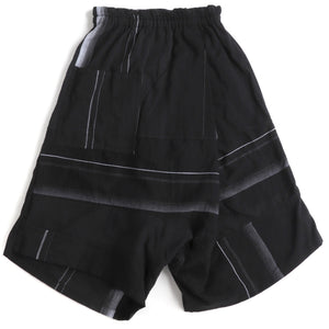 The pant is woven in a winter weight cotton. Each pant is unique and has an elastic waistband and falls to mid calf. There are deep bag pockets, one on the front and back. Can be worn with either side to the front.