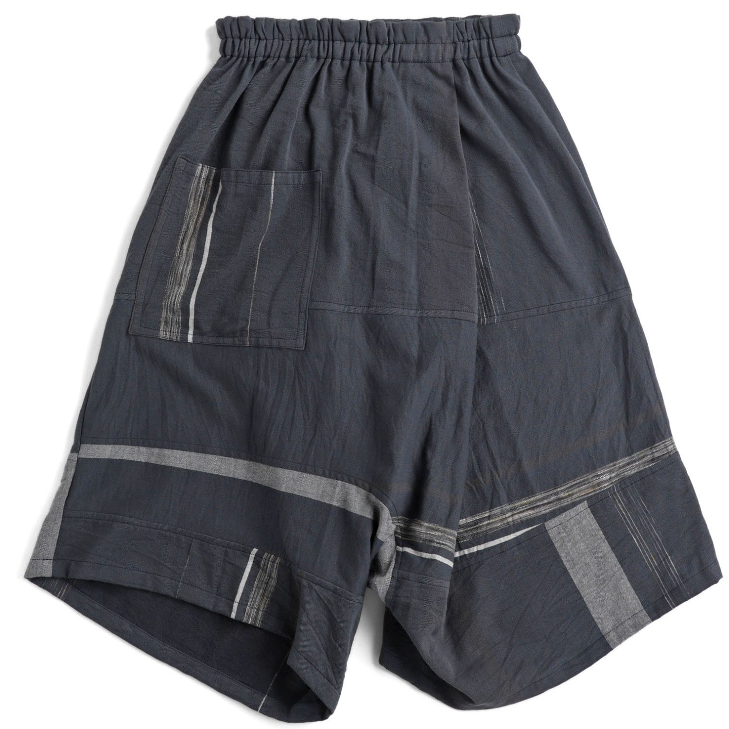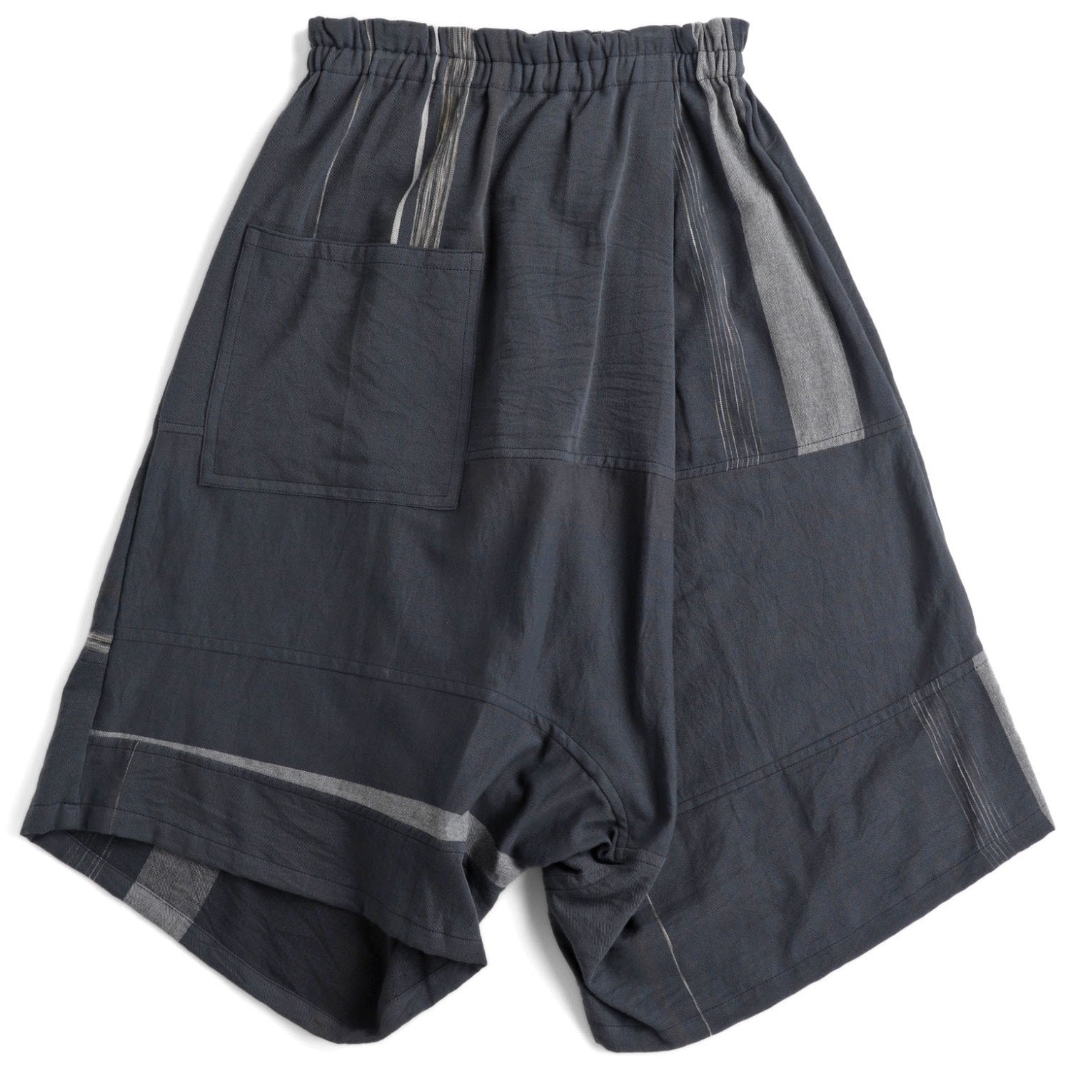 The pant is woven in a winter weight cotton. Each pant is unique and has an elastic waistband and falls to mid calf. There are deep bag pockets, one on the front and back. Can be worn with either side to the front.
