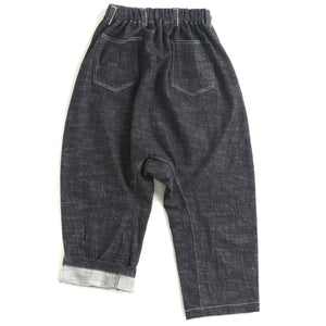 The most amazing unique denim pants, with a drop rise and elastic waist. Roll up your cuffs to see the reverse colour. Each pant is one-of-a-kind.
