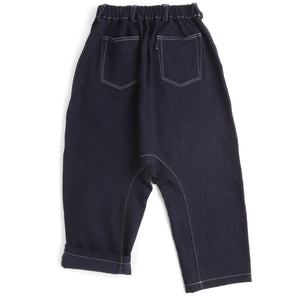 The most amazing unique denim pants, with a drop rise and elastic waist. Roll up your cuffs to see the reverse colour. Each pant is one-of-a-kind.