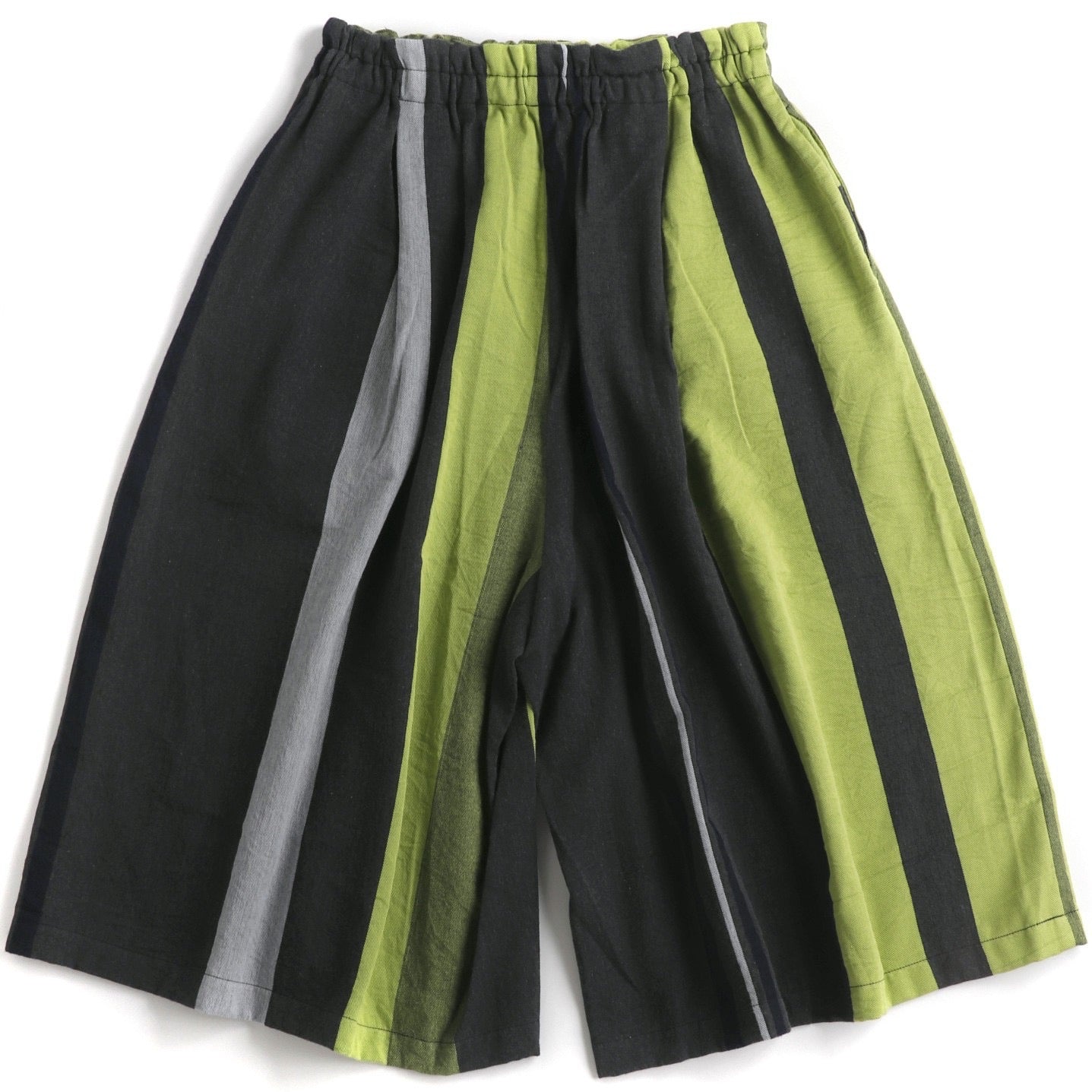 The pant is woven in a medium weight cotton in lime green with small random stripes of white, grey and navy. Each pant is unique and has an elastic waistband. It features side seam pockets and falls to mid calf.