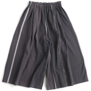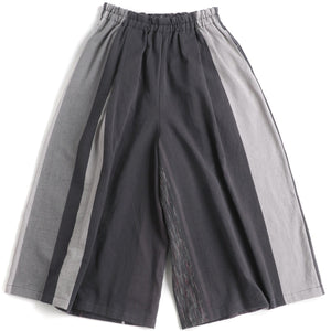 The pant is woven in a medium weight cotton in various shades of grey with a subtle purple hue and small multicoloured stripes. Each pant is unique and has an elastic waistband. It features side seam pockets and falls to ankle length.