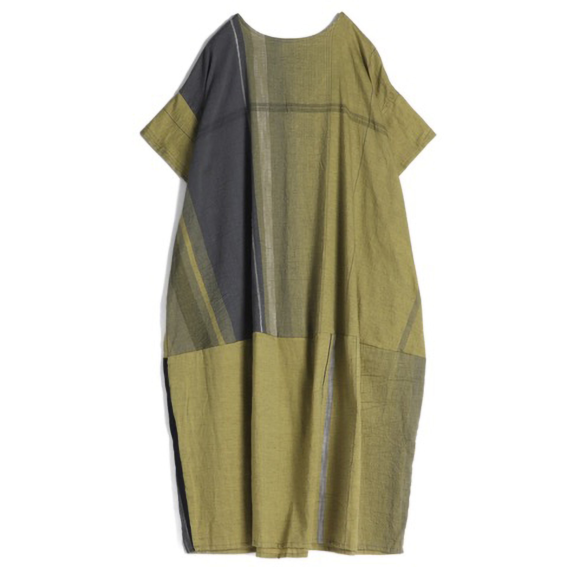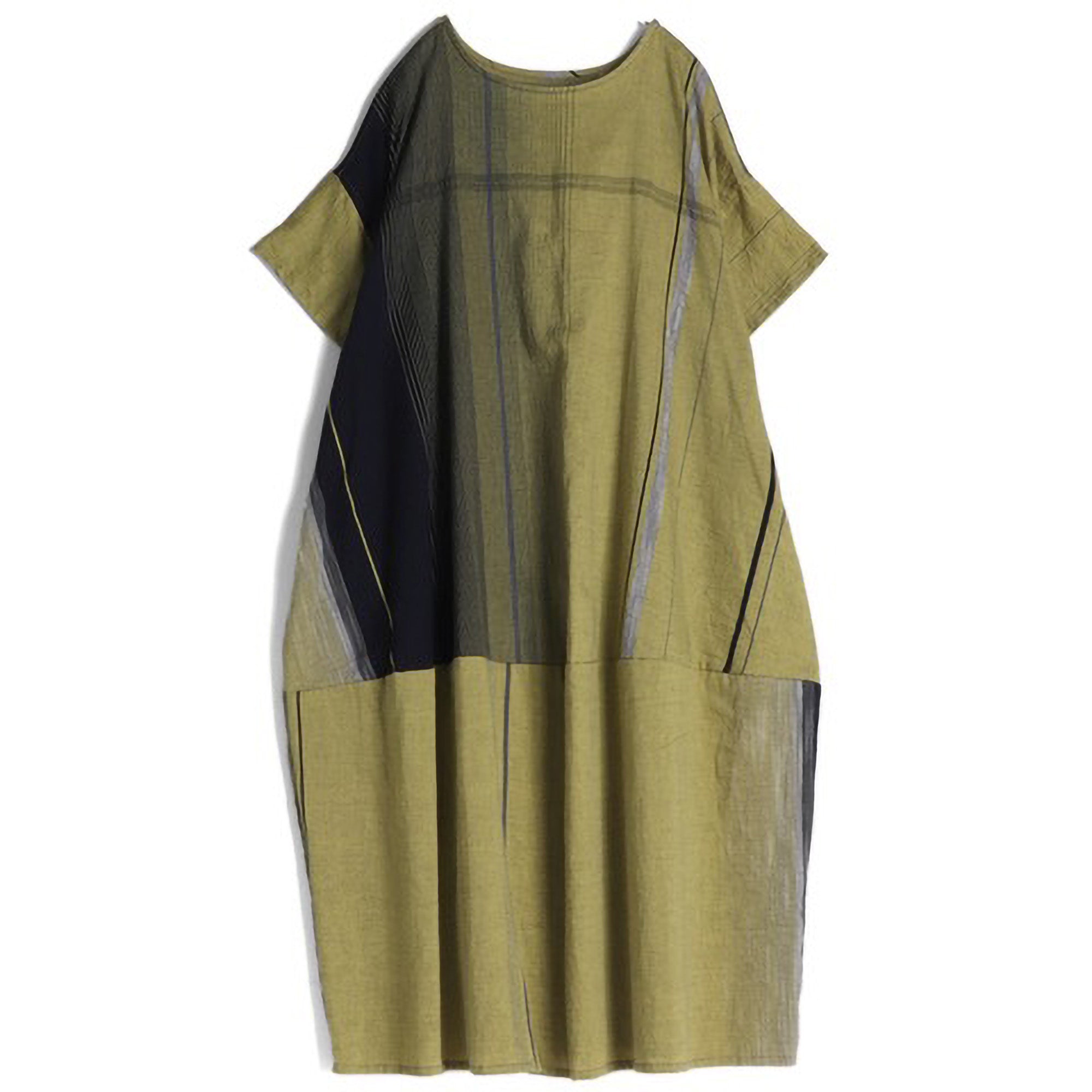 A relaxed scoop neck short sleeved dress with a dropped shoulder. There are side seam pockets and you can wear it front-to-back. Made of 100% medium weight cotton woven in varying sized stripes. It has a beautiful drape and falls to mid calf. There is a horizontal seam at mid thigh that creates a lantern shape at the hem of the dress. It has lots of ease and is great for layering over garments or by itself as a cool, breezy summer dress.