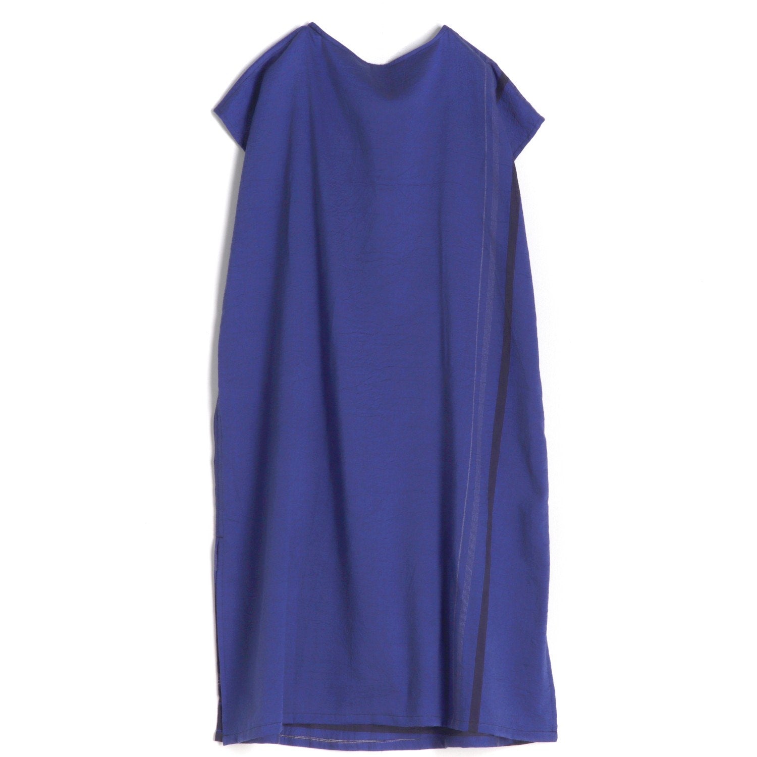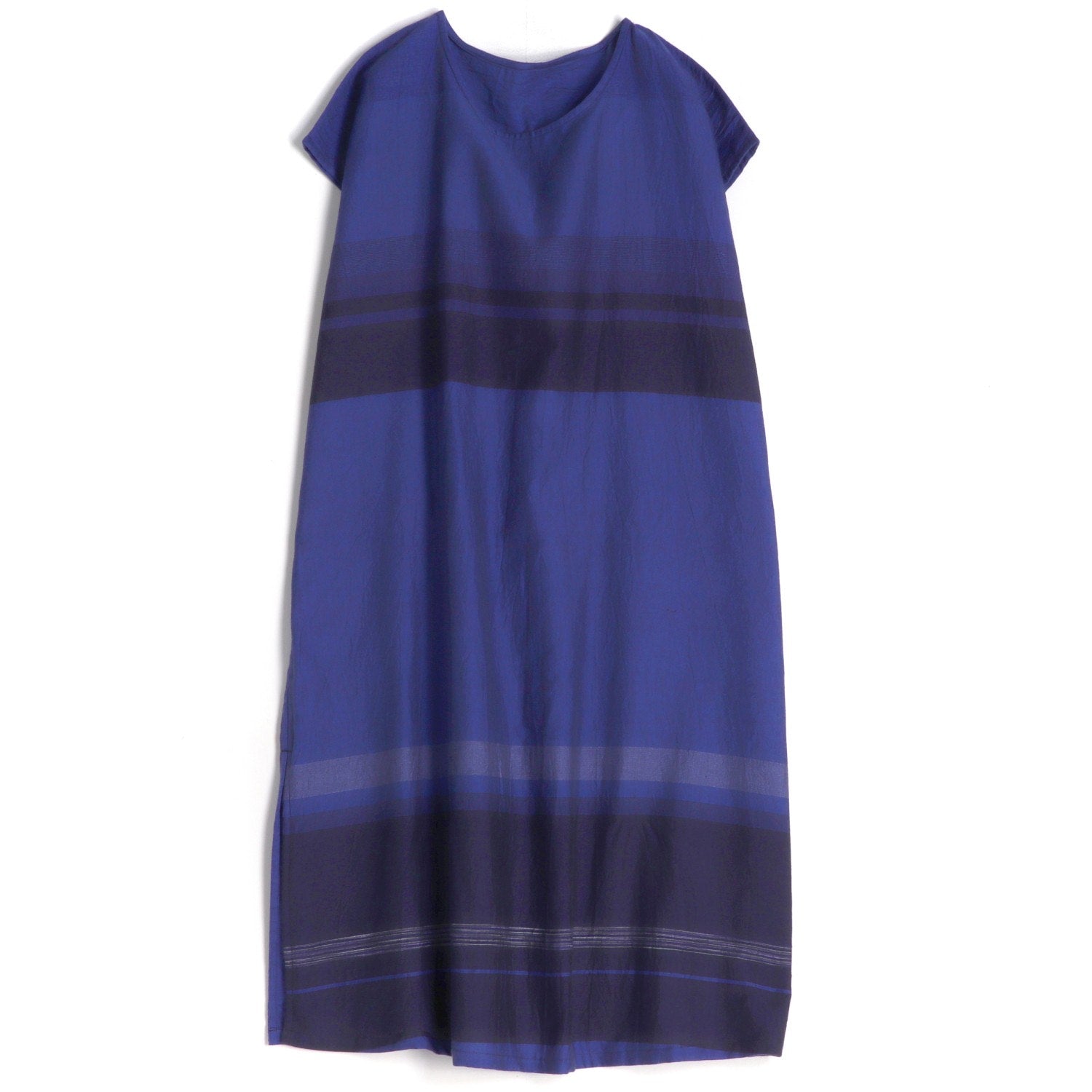 A relaxed round neck, cap sleeved dress that you can wear front-to-back. Made of 100% cotton woven in varying sized stripes. It has a beautiful drape and falls above mid calf. There are 11" slits at the hem of the side seams.