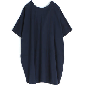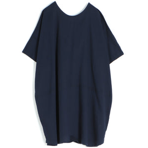 A relaxed round neck dolman sleeved tunic that you can wear front-to-back. Made of 100% woven cotton that's been dyed. It has a beautiful drape and falls just above the knee in length, with a 3” rise at each side seam hem.