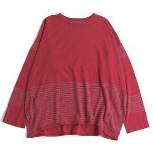 A relaxed long sleeve tee with dropped shoulders and a 1" hem at the wrist. Features a high round neckline finished with bias trim and side seams that run diagonally. The top sits 2" shorter in the front with a bias trim on the hem.