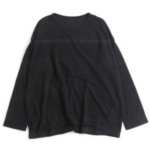 A relaxed long sleeve tee with dropped shoulders and a 1" hem at the wrist. Features a high round neckline finished with bias trim and side seams that run diagonally. The top sits 2" shorter in the front with a bias trim on the hem. This tee is one-of-a-kind and Size 1.