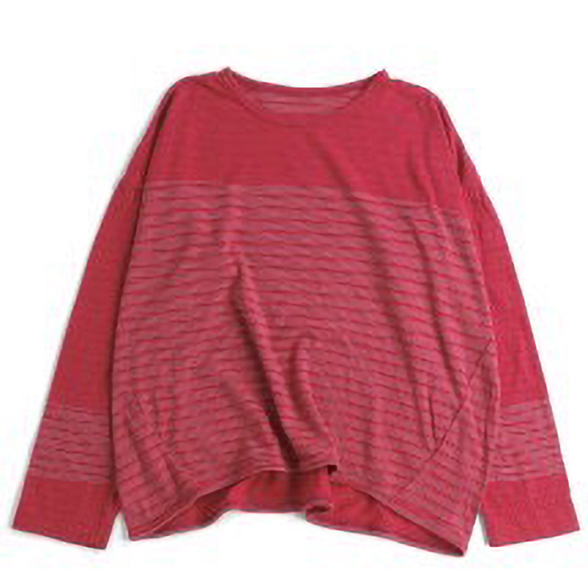 A relaxed long sleeve tee with dropped shoulders and a 1" hem at the wrist. Features a high round neckline finished with bias trim and side seams that run diagonally. The top sits 2" shorter in the front with a bias trim on the hem. This tee is one-of-a-kind and Size 1.