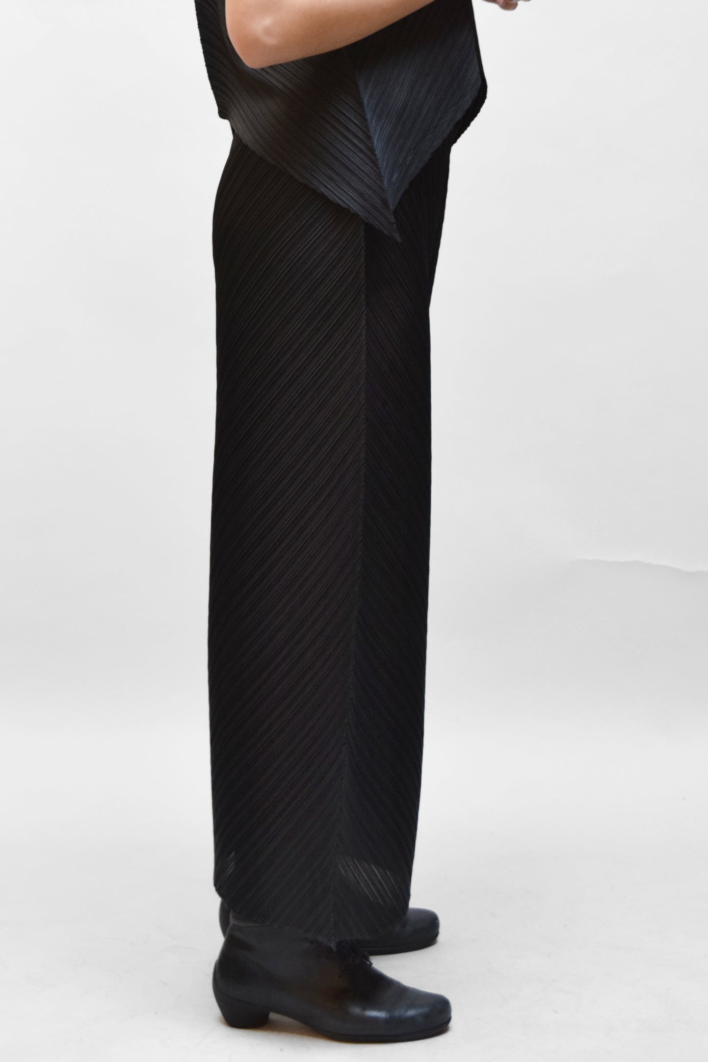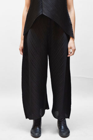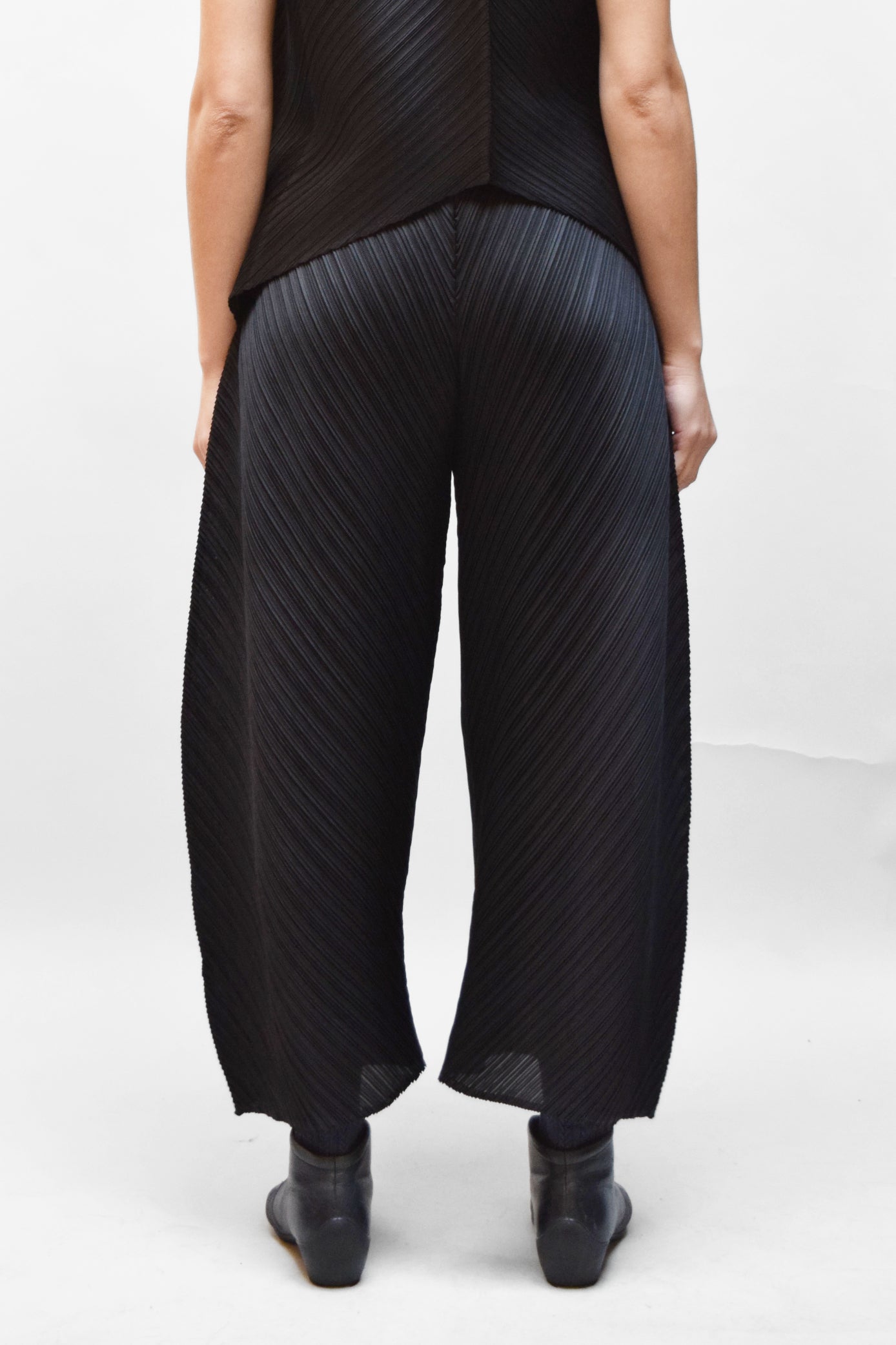 Beautiful bias-pleated pants that have great movement and comfort. They have an elastic waistband and a wide leg. These pants fall ankle-length.